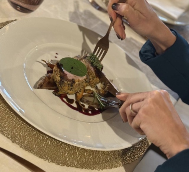 Il ristorante di Arcore propone filetto di maiale in panure alle erbe con carotine baby e scalogno al sale, riduzione di vino rosso.