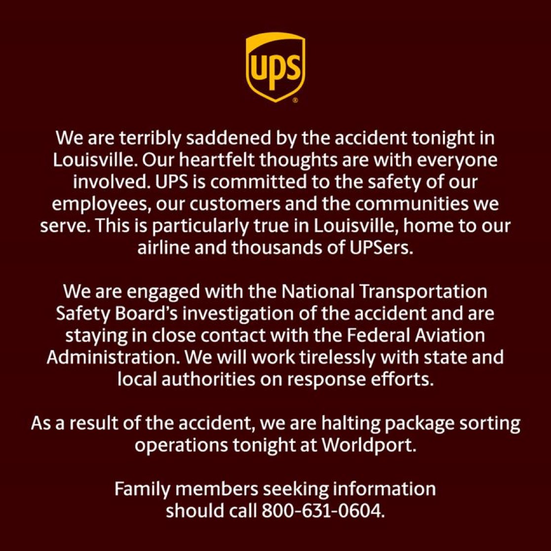 La UPS, in una nota ufficiale, ha espresso cordoglio per le vittime e ha confermato la piena collaborazione con le autorità federali per accertare le cause dello schianto.