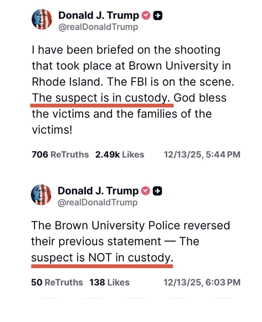 Poche ore dopo, la notizia è stata corretta. Sui media americani e sui social si è parlato di disinformazione, con l’invito a seguire esclusivamente le comunicazioni ufficiali delle autorità e dell’ateneo. Successivamente Trump ha dichiarato ai giornalisti di essere “completamente informato sulla situazione”, aggiungendo: