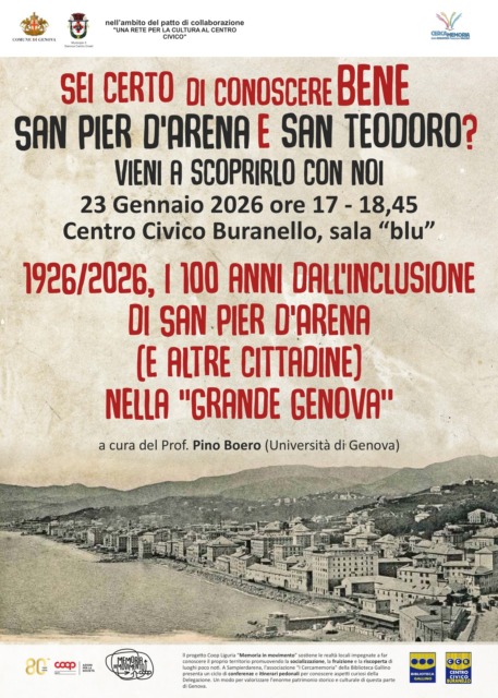 Venerdì 23 gennaio 2026 alle ore 17.00 il docente universitario, ospite dei "Cercamemoria", parlerà della inclusione nella "Grande Genova" che da allora ha cambiato radicalmente dimensione.