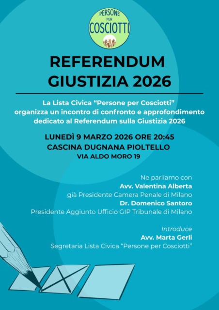 Si terrà in Cascina DugnanaPioltello, lunedì 9 marzo 2026 alle 20.45 , l’incontro di approfondimento dedicato al prossimo Referendum sulla giustizia 2026. Dato l’avvicinarsi della data del voto, che chiamerà tutti gli italiani alle urne il prossimo 22 e 23 marzo, la lista civica Persone per Cosciotti ha voluto organizzare un momento di informazione su un tema che ancora suscita molti dubbi e domande.