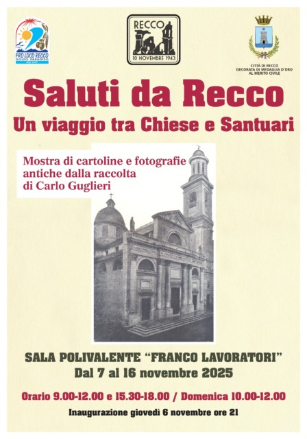 Si terrà giovedì 6 novembre 2025 alle ore 21 l’inaugurazione della mostra “Saluti da Recco – Un viaggio tra Chiese e Santuari”, un prezioso percorso tra cartoline e fotografie per riscoprire le Chiese e i Santuari che hanno segnato e segnano la vita spirituale e urbanistica di Recco.