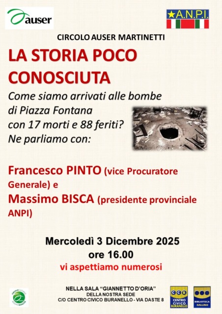 L’incontro, dal titolo “La storia poco conosciuta.Come siamo arrivati alla bomba di piazza Fontana con 17 morti e 88 feriti?” è stata promossa dal Circolo Auser Martinetti, l’ingresso è libero.