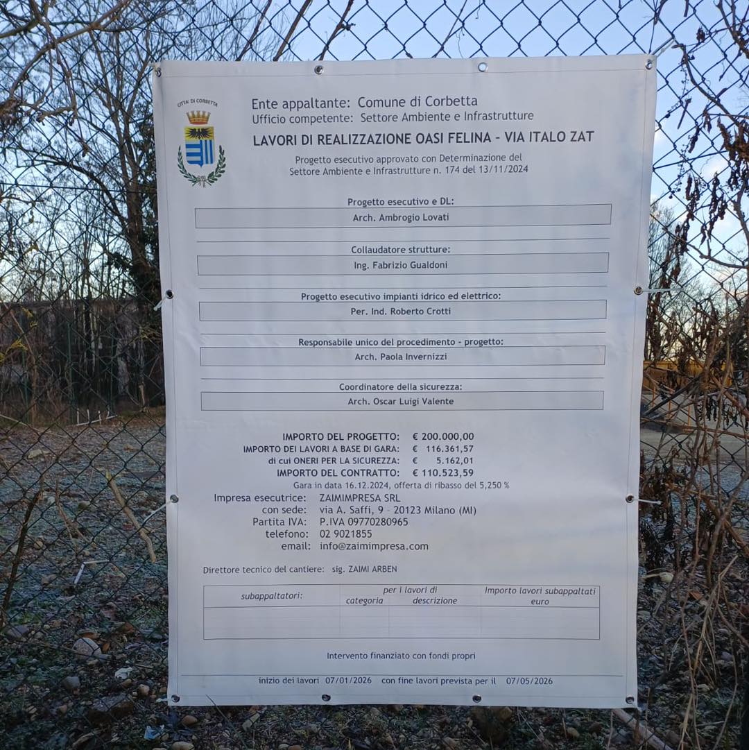 Iniziati i lavori per realizzare l’Oasi felina di Corbetta. «Le promesse che facciamo ai cittadini le manteniamo e oggi siamo felici di condividere con tutti un risultato concreto: l’Oasi felina di corbetta è realtà – afferma il sindaco Marco Ballarini – Con grande gioia annunciamo l’avvio dei lavori per questo importante progetto, dedicato alla tutela dei gatti più fragili e al contrasto del randagismo».