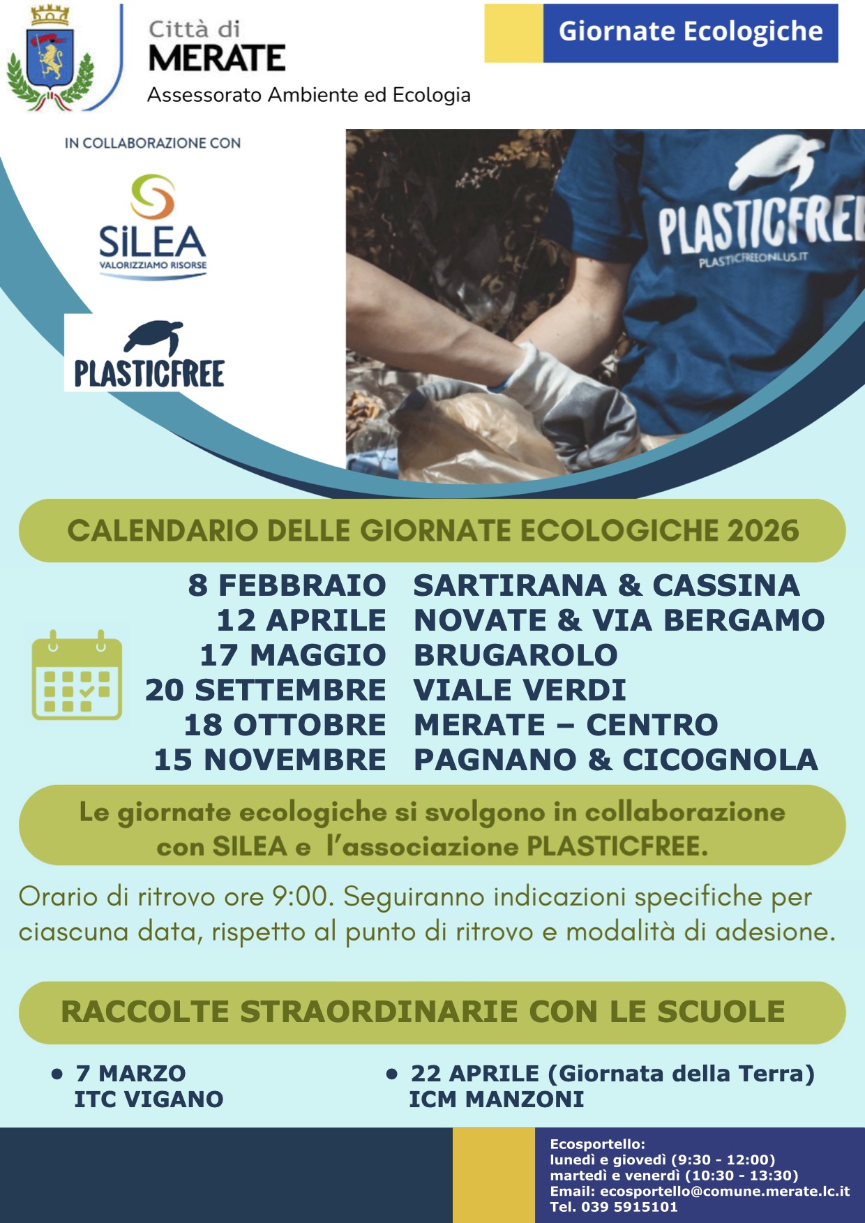 Al via le “Giornate Ecologiche” di Comune e Plastic Free.  Un intero anno dedicato alla tutela dell’ambiente, alla sensibilizzazione dei cittadini e alla cura del territorio. È questo l’obiettivo delle Giornate Ecologiche 2026, promosse dall’Amministrazione comunale di Merate in collaborazione con l’associazione Plastic Free, realtà da anni impegnata nella lotta all’inquinamento da plastica e nella promozione di buone pratiche ambientali.