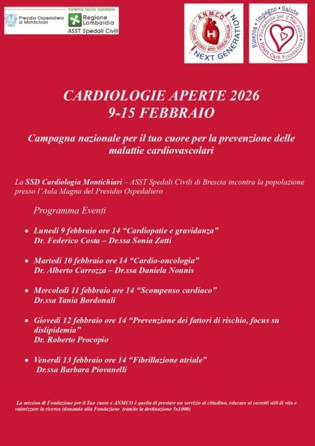 La Fondazione ANMCO per il Tuo cuore, che da oltre venti anni si impegna attivamente nella ricerca e nella prevenzione cardiovascolare, dal 9 febbraio al 15 febbraio, in occasione di San Valentino, lancia l’iniziativa nazionale di prevenzione cardiovascolare “Cardiologie Aperte 2026”, giunta alla sua ventesima edizione. Durante la settimana la Fondazione attiverà il numero verde 800 05 22 33 dedicato ai cittadini che potranno chiamare gratuitamente, da lunedì 9 a venerdì 13 dalle ore 10 alle ore 12 e dalle ore 14 alle ore 16, per porre domande sui problemi legati alle malattie del cuore, alle quali risponderanno 600 cardiologi ANMCO delle Strutture aderenti all’iniziativa, con 1300 ore di consulenza cardiologica gratuita. L’iniziativa si svolgerà anche in presenza per l’intera settimana e in alcune cardiologie si eseguiranno gratuitamente screening cardiologici personalizzati e/o dibattiti ed eventi di formazione sulle diverse tematiche. Sul sito della Fondazione sarà pubblicato il calendario delle attività previste con i giorni e gli orari di risposta telefonica oltre alle iniziative in presenza sull’intero territorio. Quest’anno la Fondazione per il Tuo cuore desidera in particolare puntare l’attenzione su: Fibrillazione atriale, Cardioncologia e Cardioncologia di Genere, Cardiopatie e Gravidanza, Scompenso Cardiaco e Prevenzione dei fattori di rischio modificabili con focus su Dislipidemia, per sensibilizzare i cittadini a riguardo e prevenire alcune delle più diffuse patologie cardiovascolari.
