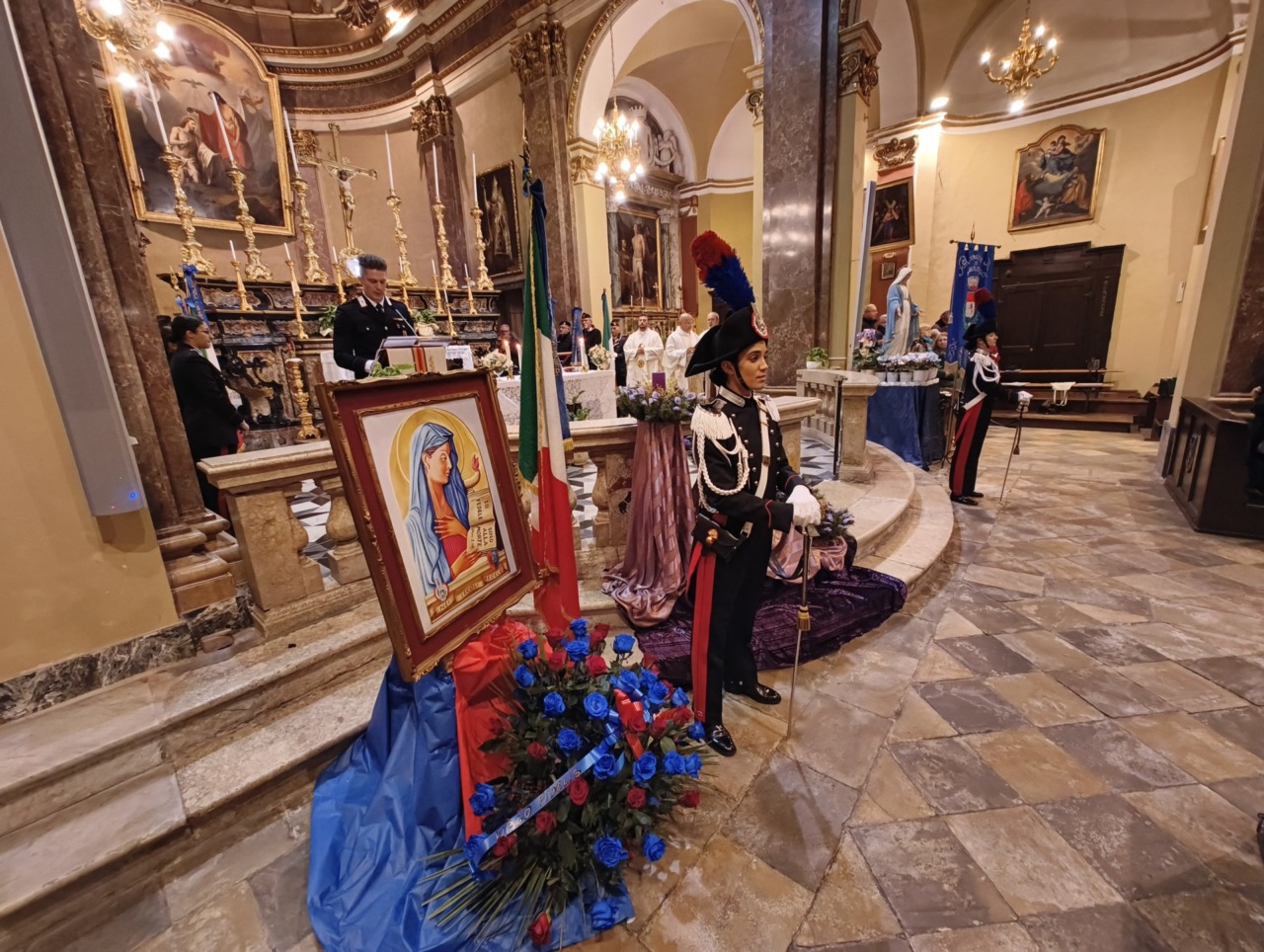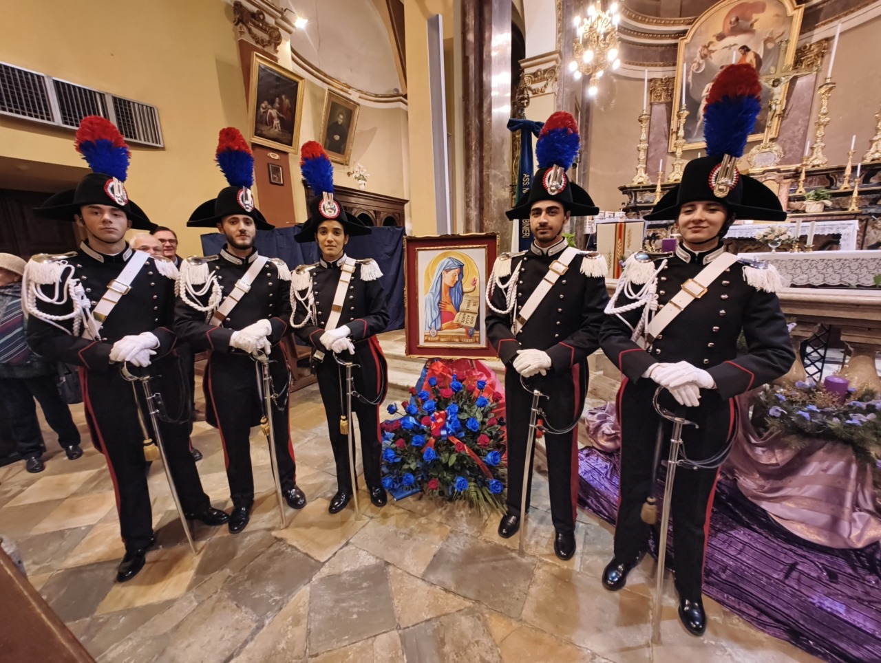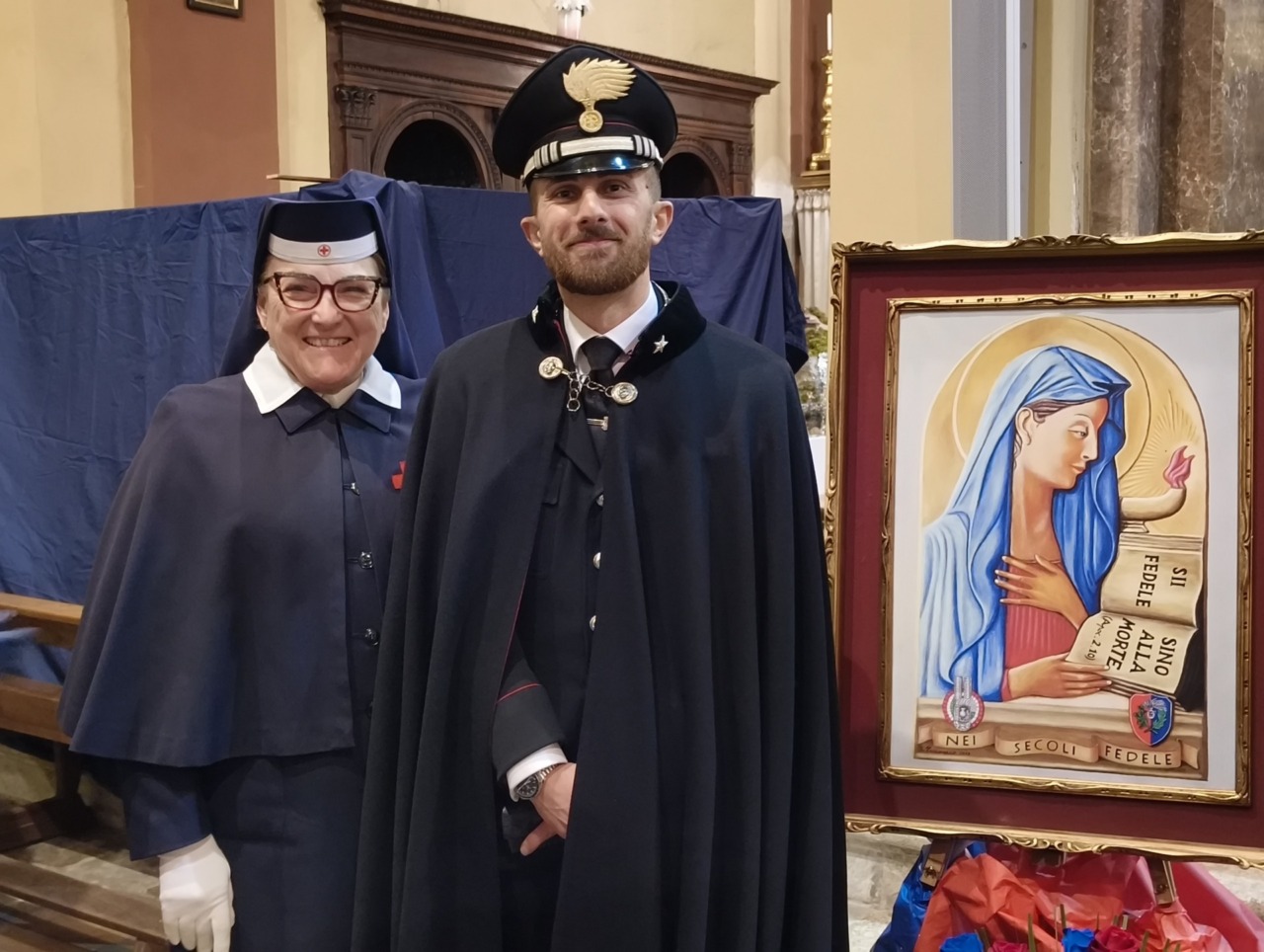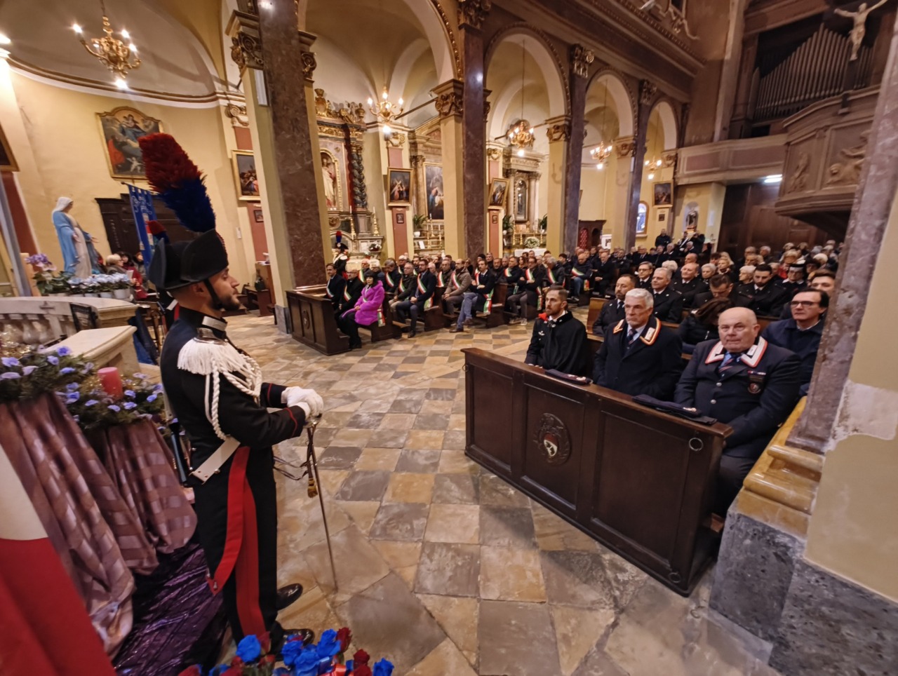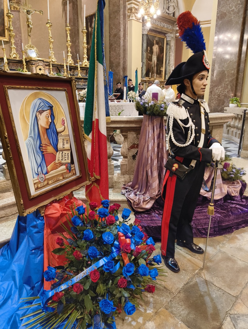 Ai piedi dell’altare, tra Carabinieri in Grande Uniforme Storica, l’effige della Virgo Fidelis con l’omaggio floreale della Sezione di Verolengo dell’Associazione Nazionale Carabinieri guidata da Giovanni Oggian, che ha lavorato a stretto contatto con la Compagnia per organizzare la cerimonia.