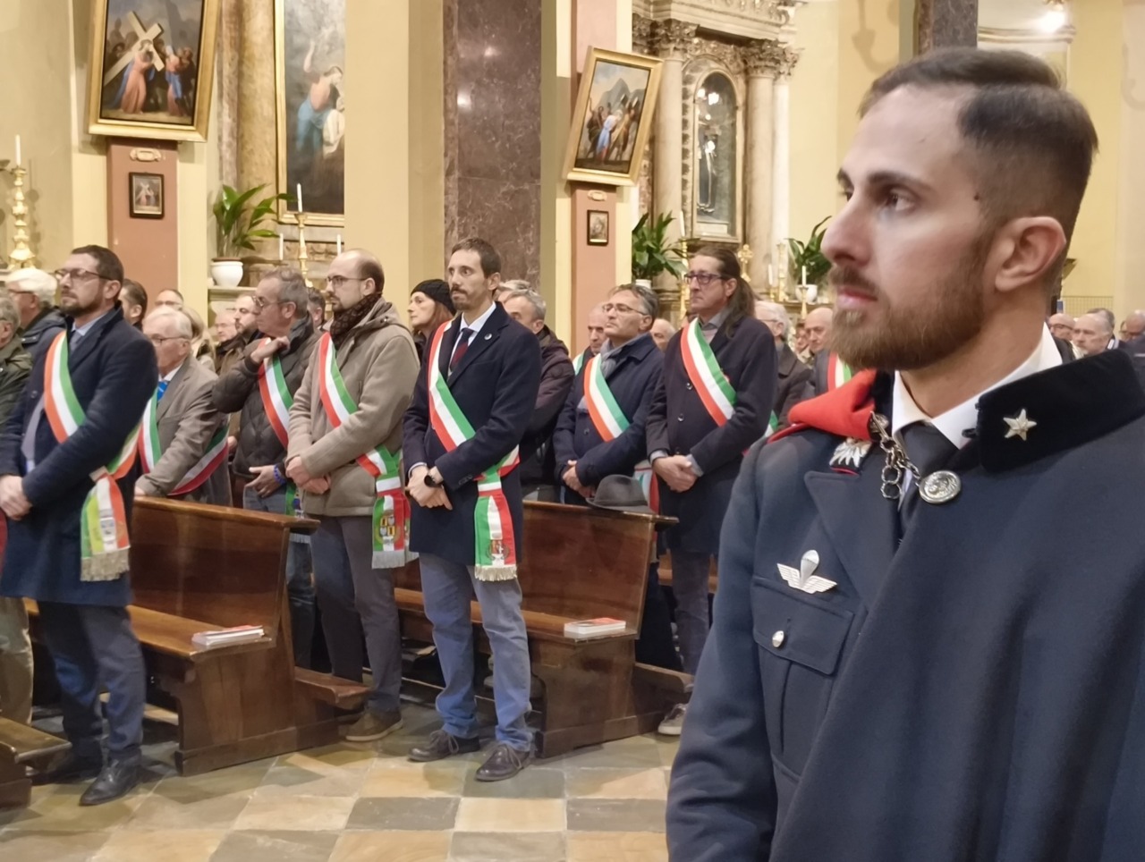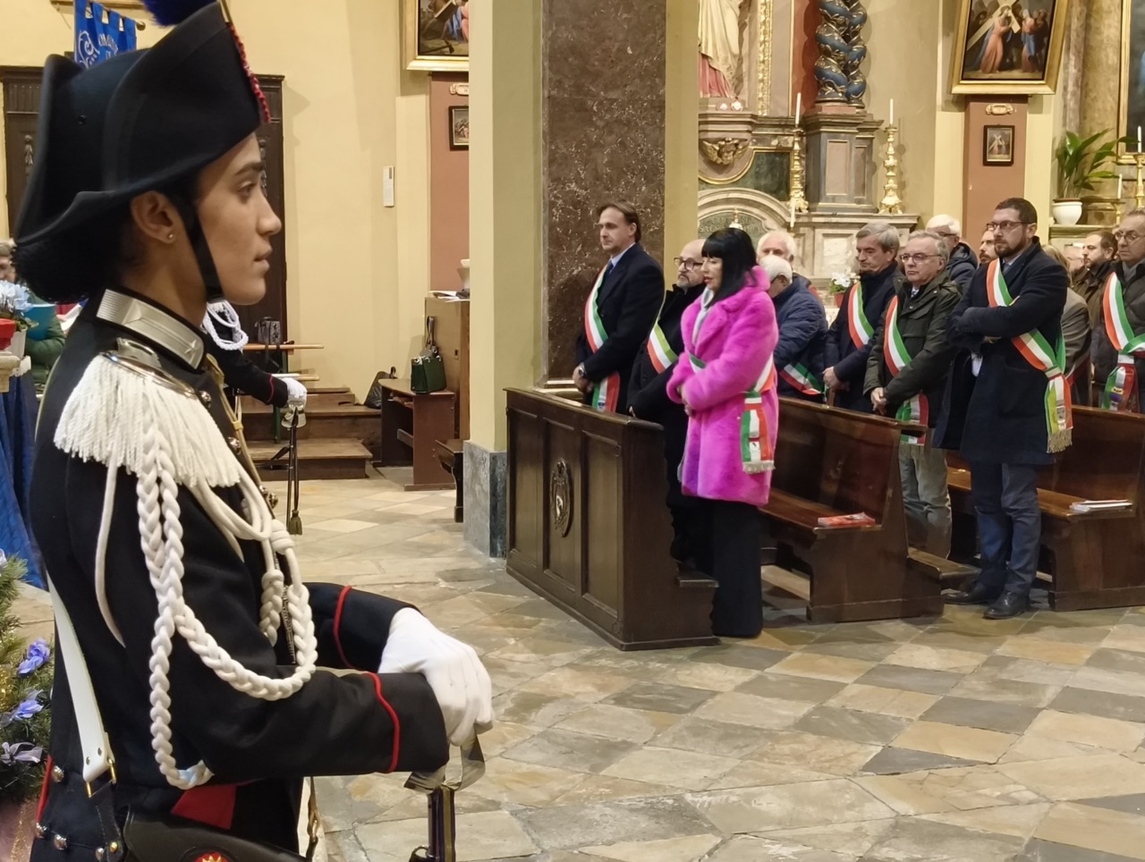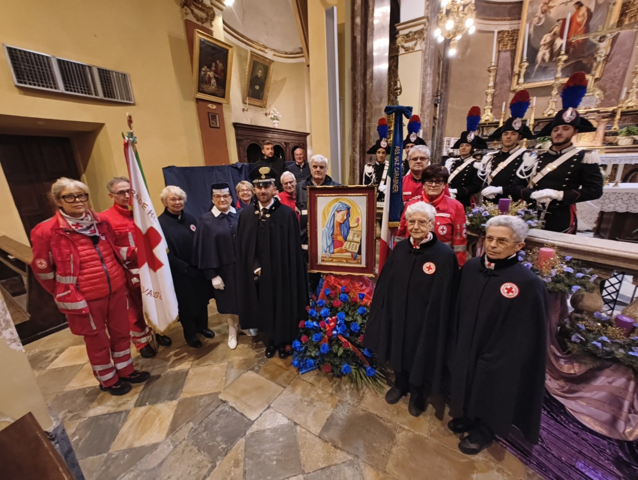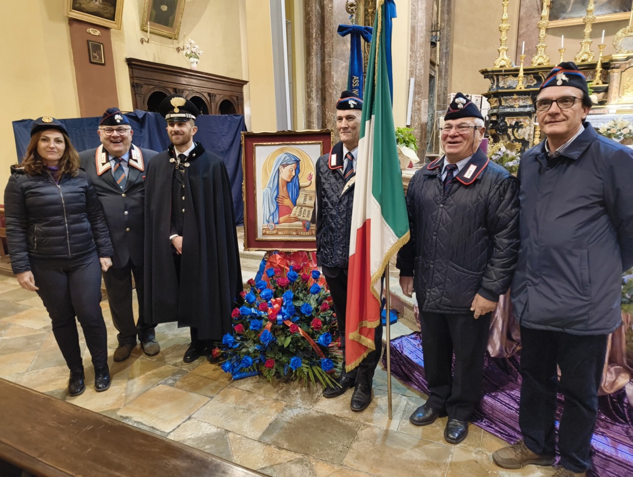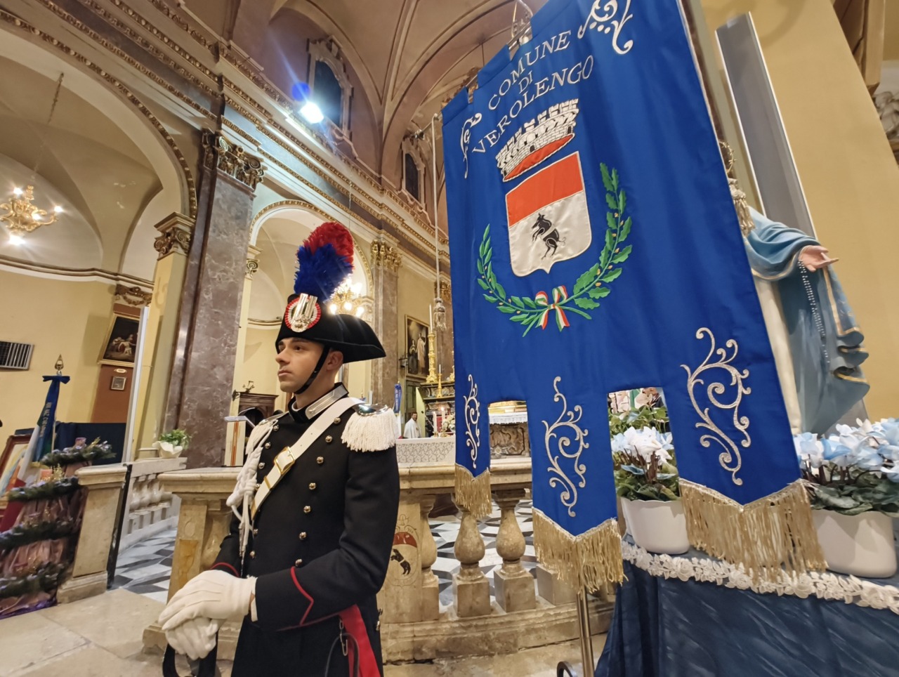 Ai piedi dell’altare, tra Carabinieri in Grande Uniforme Storica, l’effige della Virgo Fidelis con l’omaggio floreale della Sezione di Verolengo dell’Associazione Nazionale Carabinieri guidata da Giovanni Oggian, che ha lavorato a stretto contatto con la Compagnia per organizzare la cerimonia.
