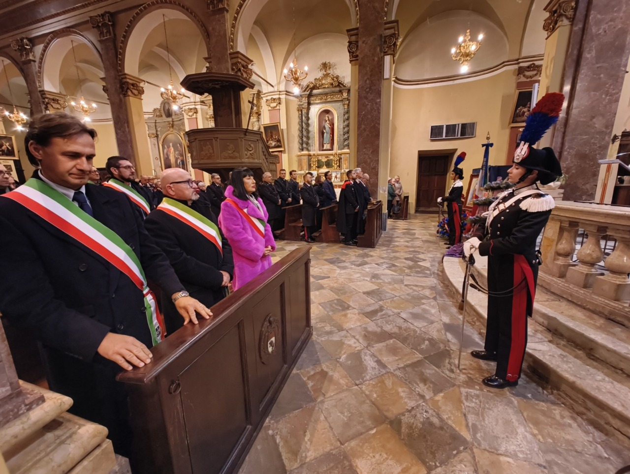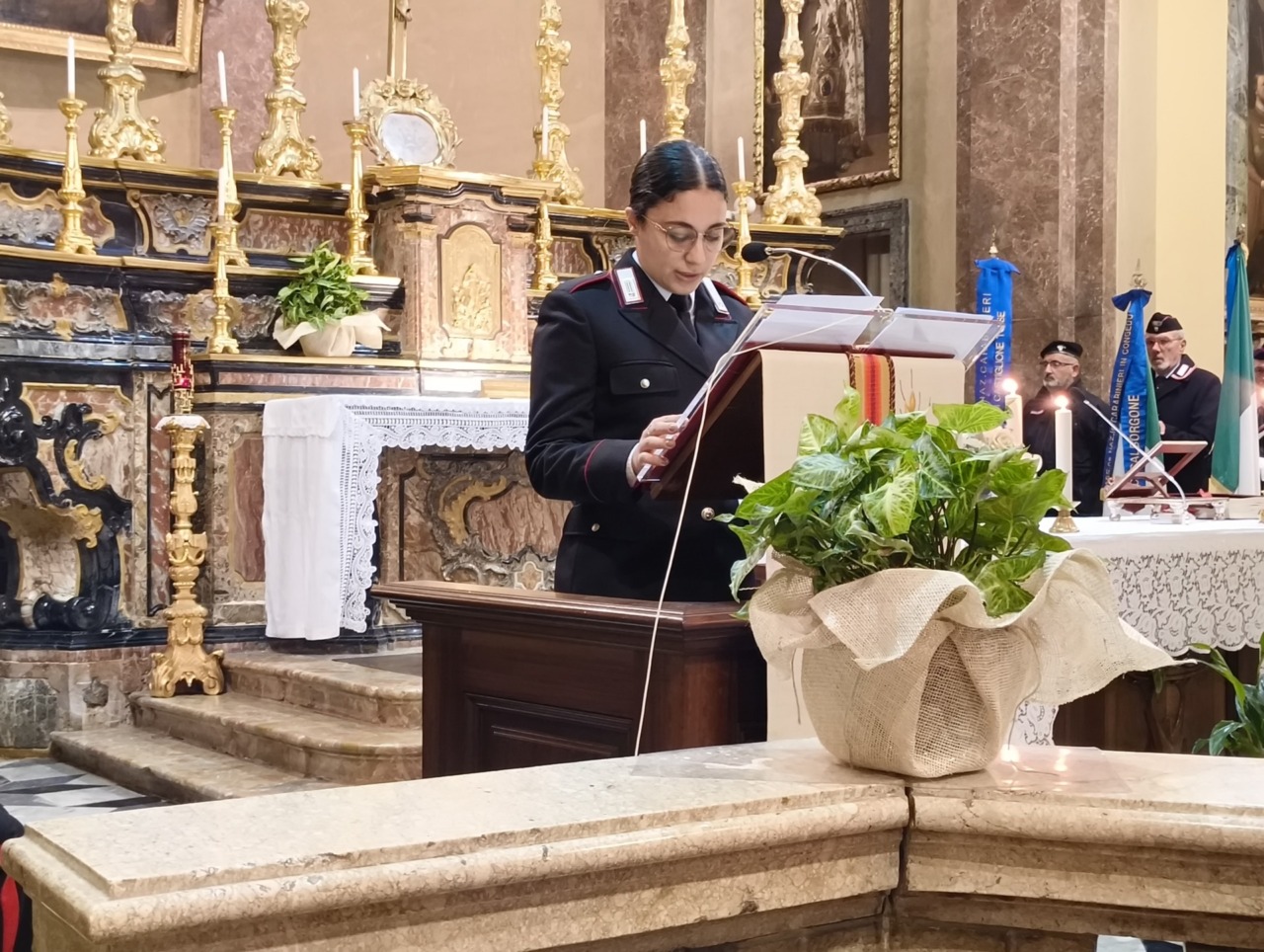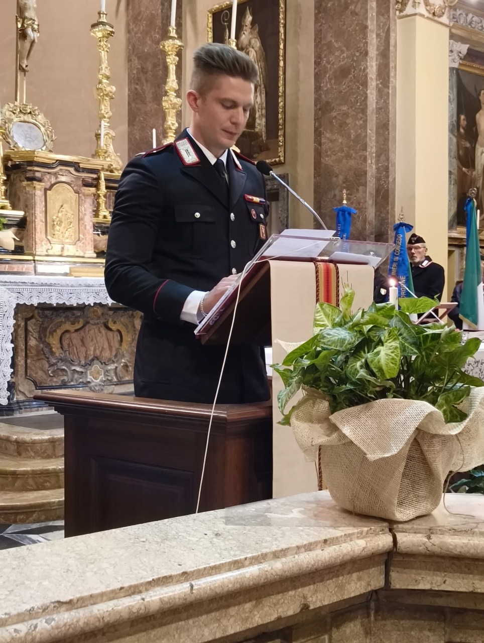 “Buonasera a tutti – ha esordito il Capitano Urbano Marrese nel suo saluto al termine della funzione religiosa – e permettetemi di ringraziare tutti quanti perché sono molto contento di vedere la chiesa piena, non solo di Carabinieri, ma anche di cittadini, di sindaci e di rappresentanti istituzionali. Il mio ringraziamento va anzitutto a chi ci ospita, quindi alla sindaca e a don Valerio che sono stati estremamente gentili e disponibili ad accogliere anche tutte le nostre richieste per celebrare la Virgo Fidelis quest’oggi. Ringrazio ovviamente il cappellano militare don Diego Maritano che con le sue parole ancora una volta illumina il nostro cammino e i nostri pensieri: riesce con una capacità veramente encomiabile a trovare spunti di riflessione molto molto profondi e di questo lo ringrazio. Oggi ricorre, o meglio ricorre il 21 novembre e oggi la celebriamo, la Virgo Fidelis a cui, come ricordava don Diego, nel 1949 è stata affidata, e forse questo il termine più adatto, l’Arma dei Carabinieri. Il 21 novembre è stato scelto per due motivi. Il primo è ovviamente liturgico, perché in quel giorno si celebra la presentazione della Beata Vergine Maria. Il secondo riguarda un fatto storico che mi piace riprendere perché in qualche modo costituisce l’essenza di quello che i Carabinieri ogni giorno fanno sul territorio. Ed è la battaglia di Culqualber, una battaglia che nel 1941 vide protagonista un battaglione di Carabinieri, in Africa, durante la Seconda Guerra Mondiale. Battaglia durante la quale i Carabinieri furono sconfitti, ma furono sconfitti con onore. Si batterono fino all’ultimo respiro nel vero senso della parola, tant’è che il nemico gli tributò un onore che raramente viene concesso al nemico, l’onore delle armi. Ecco, questo è assolutamente importante da sottolineare perché riprende un po’ il servizio che quotidianamente svolgiamo sul territorio. Ognuno al proprio livello e e ognuno secondo le proprie attribuzioni. In questo mi rivolgo ovviamente ai Comandanti di Stazione, ai Carabinieri che quotidianamente vedete sulle strade dei vostri comuni, delle vostre città. Operano con attenzione, con assoluta disponibilità verso il cittadino e con un fine ultimo, quello della sicurezza e della serenità della cittadinanza. E io ringrazio di cuore i Carabinieri che oggi hanno partecipato a questa celebrazione per quello che quotidianamente fanno, soprattutto per la sicurezza e la salvaguardia di ognuno di noi”.
