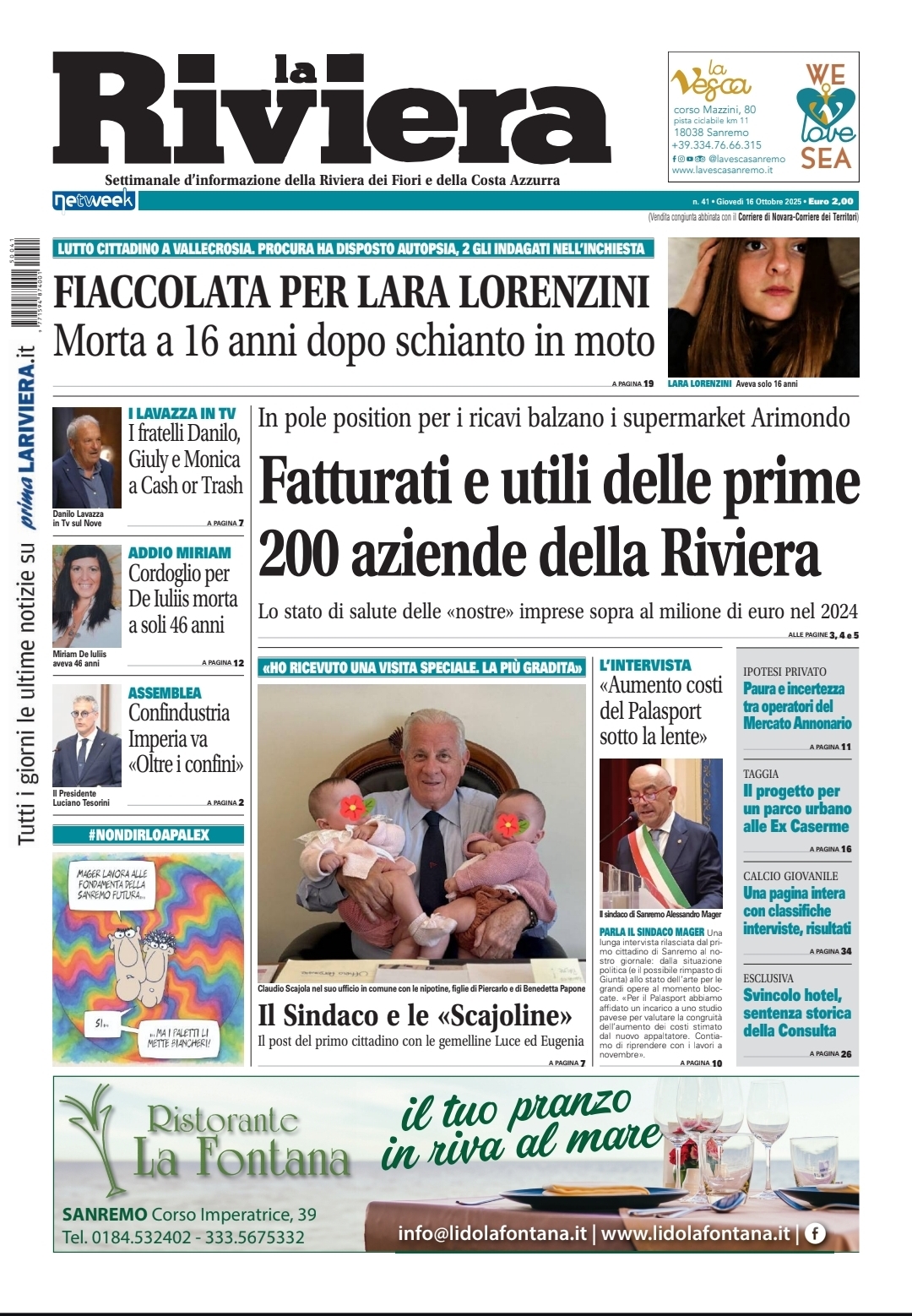 Il nuovo numero de La Riviera è in edicola come ogni giovedì da 35 anni con interviste, approfondimenti e notizie esclusive dalla provincia di Imperia. Eccone alcune