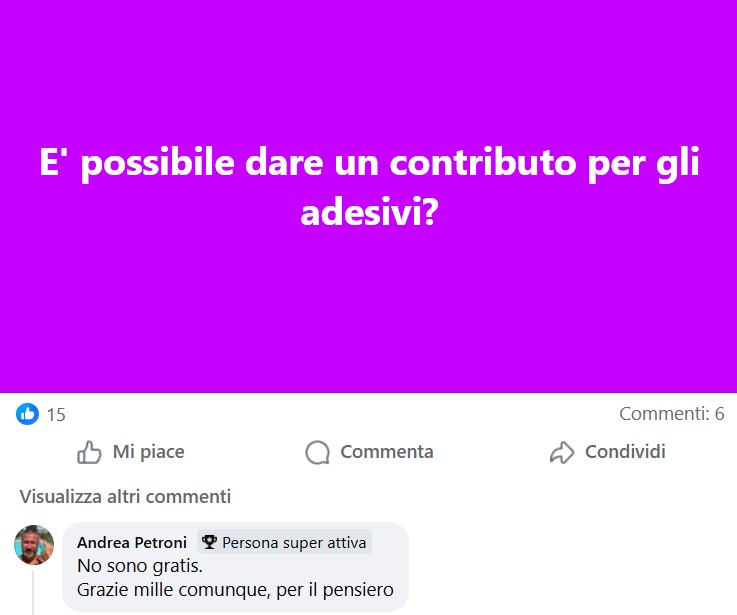 L’iniziativa è nata da un semplice spirito di comunità non senza un pizzico di ironia beffarda: “Gli adesivi sono pronti. Sono GRATIS, non c’è da pagare nulla”, ha scritto Petroni nel suo annuncio sul gruppo social. “Inizierò la distribuzione nei punti di ritiro. Non mi scrivete in privato dove si possono ritirare, perché finché non li ho portati e non ho la certezza che l’esercizio non si tiri indietro dal consegnarli, è inutile che lo scriva”.