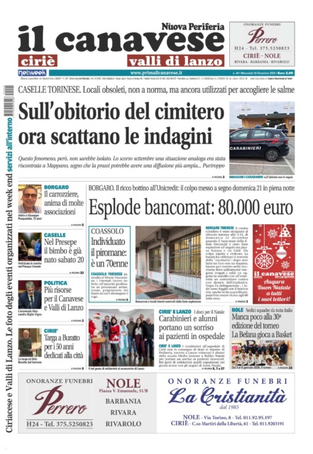 In prima pagina le indagini a Caselle sullo stato dell’obitorio del cimitero: locali vetusti e non a norma, un caso analogo scoperto nei mesi scorsi a Mappano. Malviventi in azione a Borgaro: esplode il bancomat Unicredit. La visita in ospedale a Ciriè dei carabinieri che hanno “scortato” Babbo Natale fra le corsie della Pediatria.