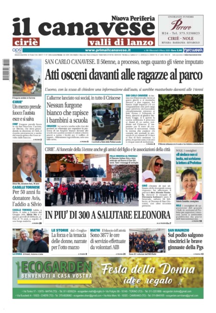 In prima pagina le accuse di atti osceni davanti a minorenni a San Carlo, l’uomo, 50enne, respinge gli addebiti durante il processo in tribunale a Ivrea. Il messaggio fake che circola da settimane sui gruppi social di tutto il Canavese su presunti furgoni con persone a bordo che si aggirano nei luoghi frequentati dai bambini per rapirli. L’ultimo saluto a Eleonora Antisso, 51anni: a Ciriè una folla commossa.
