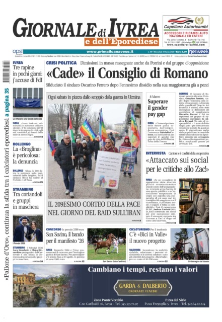 In evidenza la crisi politica del Consiglio comunale di Romano, i consiglieri si sono dimessi in massa, sfiduciato il sindaco Oscarino Ferrero. Il 209esimo corteo a Ivrea contro la guerra in Ucraino: dallo scoppio ogni sabato in piazza per dire “Stop”.