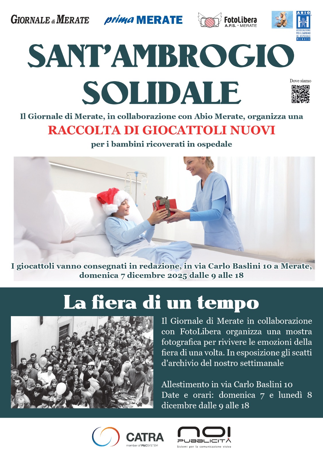 Questa mattina, domenica 7 dicembre 2025, è stata inaugurata la doppia iniziativa del Giornale di Merate intitolata “Sant’Ambrogio solidale”. L’evento comprende due progetti: la raccolta di giocattoli in redazione a favore dei bambini ricoverati in ospedale, in collaborazione con Abio Merate, e la mostra fotografica con immagini storiche della Fiera, realizzata insieme a FotoLibera.