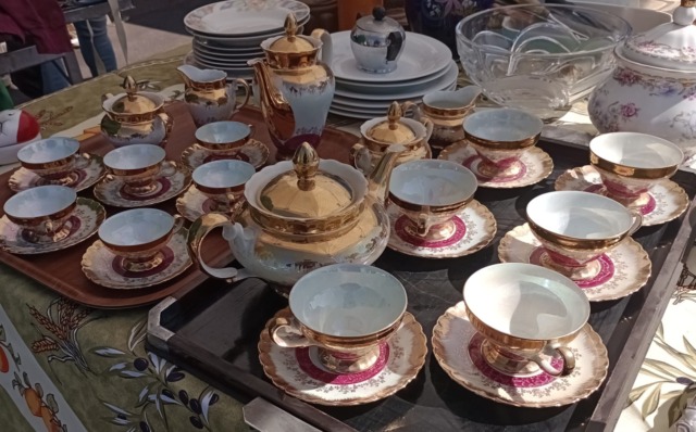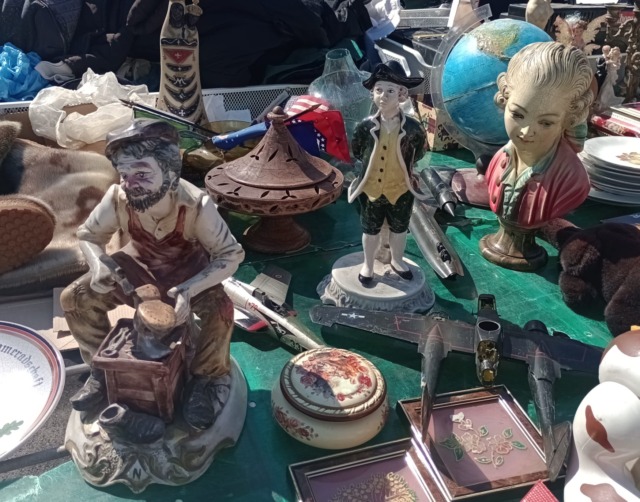 La macchina del tempo si attiva guardando le migliaia di oggetti in vendita. Si rimane sedotti dai quadri, dalle cornici, dai documenti vecchi, dai ritratti di donne di fine ‘800. Le macchine da scrivere dei primi del ‘900. Tra gli articoli più affascinanti le statuine in stile vecchia Parigi, i servizi di posate, di piatti e tazze da the, servizi di porcellane d’epoca. Qualcuno vende anche mobilia da salotto, i comodini del nonno sormontati da ritratti fotografici di famiglie sconosciute. Le radio (oggi ritenute giganti) attraversi cui si ascoltava Radio Londra, poi le macchine fotografiche prodotte tra il 1940 e il 1970. Il settore della monete antiche e delle banconote attira gruppi di visitatori che si accalcano attorno al banco sfogliando i folder con occhi ammirati. Non mancano i dischi in vinile e i vecchi giradischi. Le grandi bambole marchiate 1939 rivelano un mondo e uno stile di vita andato via, ma rimesso nuovamente in circolo da questi bancarellisti.