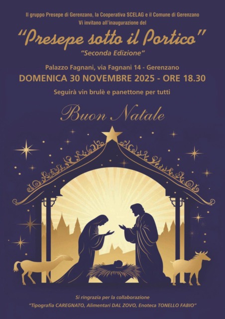 Dopo il successo dello scorso anno, torna il “presepe sotto il portico”. L’appuntamento sarà domenica 30 novembre alle 18.30 sotto il portico di palazzo Fagnani/Clerici in via Fagnani 14 a Gerenzano.