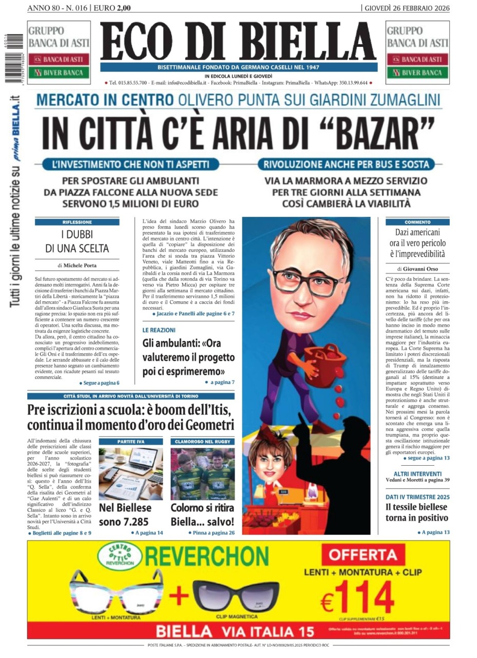 Eco di Biella torna in edicola oggi, giovedì 26 febbraio, con tante notizie e approfondimenti, tra cui in apertura: “In città c’è aria di bazar”. L’idea del sindaco Marzio Olivero ha preso forma lunedì scorso quando ha presentato la sua ipotesi di trasferimento del mercato in centro città. L’intenzione è quella di “copiare” la disposizione dei banchi del mercato europeo, utilizzando l’area che si snoda tra piazza Vittorio Veneto, viale Matteotti fino a via Repubblica, i giardini Zumaglini, via Garibaldi e la corsia nord di via La Marmora (quella che dalla rotonda di via Torino va verso via Pietro Micca) per ospitare tre giorni alla settimana il mercato cittadino. Per il trasferimento serviranno 1,5 milioni di euro e il Comune è a caccia dei fondi necessari.
