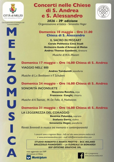 Si prevede un mese di maggio immerso nella musica con la rassegna di concerti MelzoMusica. L’evento patrocinato e sostenuto dal Comune di Melzo in collaborazione con “Amici di Sant’Andrea” giunge quest’anno alla sua 39° edizione. I concerti a ingresso libero si terranno ogni domenica del mese: il primo il 10 maggio alle 21 nella Chiesa di San’Alessandro, i seguenti nella Chiesa di San’Andrea alle ore 16.