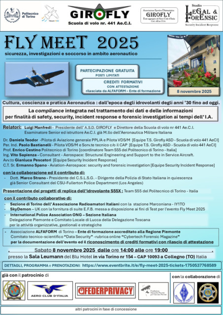 Il Fly Meet è promosso e organizzato da GiroFly asd con il patrocinio della Città metropolitana di Torino. L’evento, oltre ad aspetti storici della navigazione aerea, affronterà temi più specialistici, trattati da eminenti relatori, tra cui il presidente Luigi Manfredi e altri membri del team di GiroFly, gli esperti del Team S.55 del Politecnico di Torino, piloti, consulenti, ingegneri aerospaziali, gli esperti dell’equipe di Studio Legal & Forensic e dell’agenzia Alfaform. L’iniziativa è organizzata con la collaborazione e il contributo di Marco Strano, presidente del Centro Studi per la Legalità, la Sicurezza e la Giustizia ed ex dirigente della Polizia di Stato. Tra gli argomenti che saranno trattati nelle relazioni figurano i piani di volo e le reali condizioni operative, gli strumenti analogici e digitali per la navigazione aerea, i briefing pre-volo, le manovre di emergenza e le situazioni-limite, le attività di misurazione e i margini di errore e tolleranza, il trattamento dei dati relativi all’entità composta da aereo e pilota, l’impiego illecito di droni, le investigazioni sulla sicurezza della navigazione aerea e la sicurezza delle investigazioni.