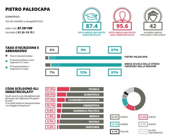 Dalla nostra analisi sui dati di Eduscopio 2025 ne è emerso che il liceo scientifico Pietro Paleocapa di Rovigo ha raggiunto il voto medio di maturità più alto: gli alunni di quinta che poi si sono immatricolati all’università hanno ottenuto una votazione media di 87,40, il valore più alto tra tutte le scuole superiori della provincia di Rovigo.