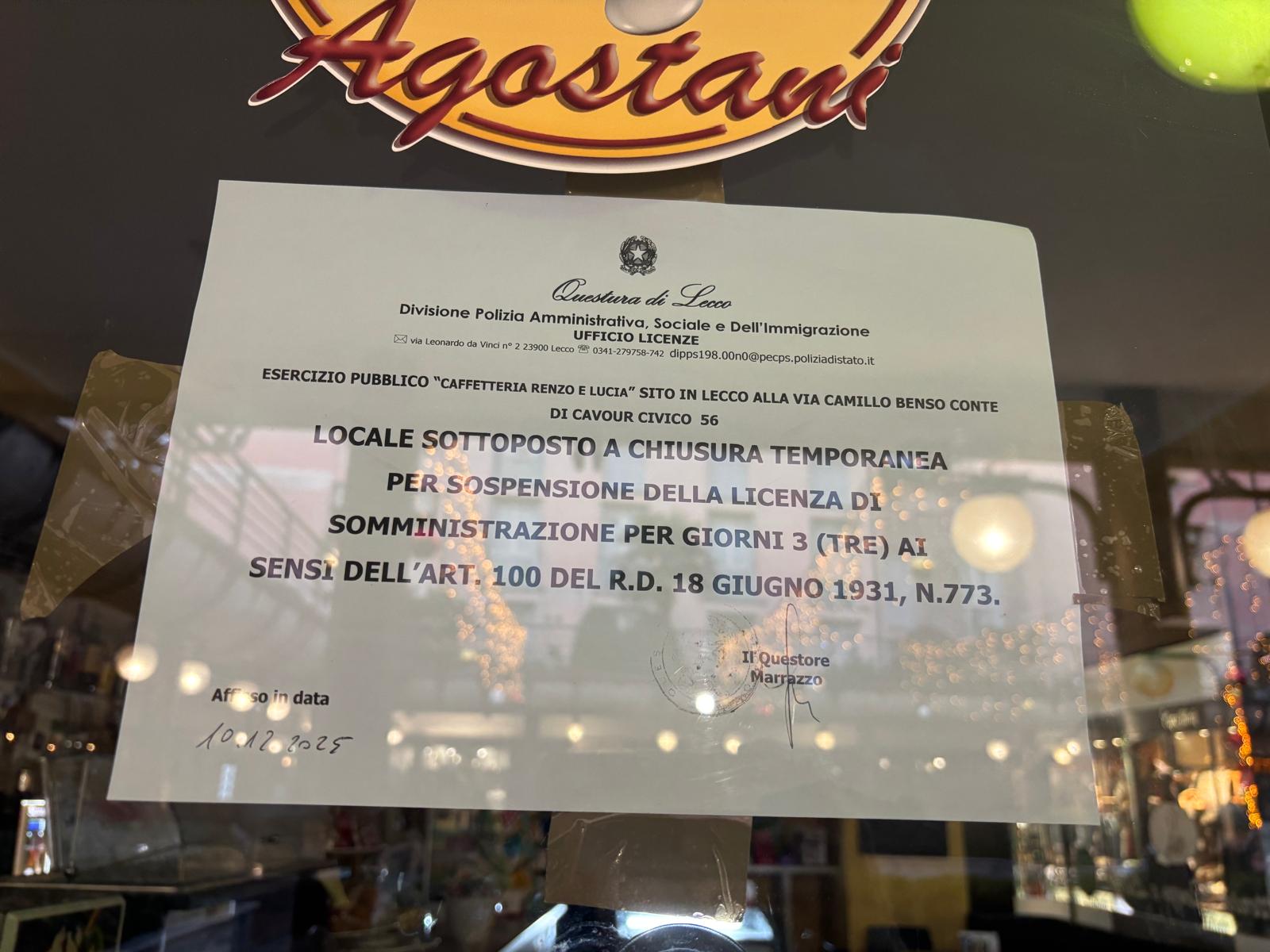 Lecco, ancora chiuso per 3 giorni il bar Renzo e Lucia. Licenza sospesa dalla Questura