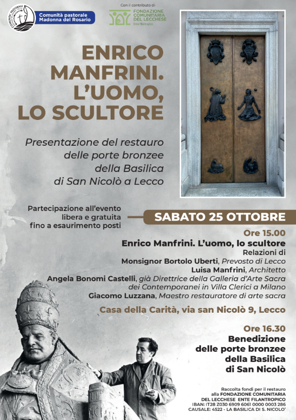 La rievocazione delle vicende legate alle porte della basilica lecchese, realizzate in collaborazione con l’allora prevosto, monsignor Enrico Assi, su iniziativa della Banca Popolare di Lecco, sarà l’occasione per riscoprire la figura di Enrico Manfrini, tra i principali protagonisti della scultura italiana del XX secolo, autore di numerose opere in bronzo distribuite nel territorio lecchese.