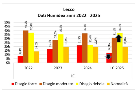 Il confronto dei dati Humidex tra il 2022 e il 2025 mostra come l’estate 2025 abbia segnato un’inversione di tendenza rispetto agli anni precedenti. A Lecco, la percentuale di giornate con “Disagio Forte” si è ridotta di nove punti percentuali rispetto al 2024 (21,5% vs 12,3%), mentre le giornate con “Disagio Debole” sono aumentate al 36,8%. Analogamente, a Monza e Brianza si osserva una diminuzione del disagio forte e un incremento del disagio debole.