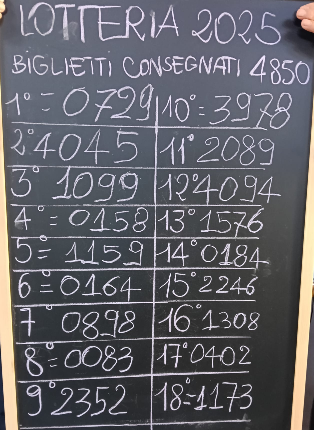 • Primi tre classificati: 500 euro ciascuno. I tagliandi fortunati sono  729 – 4045 – 1099