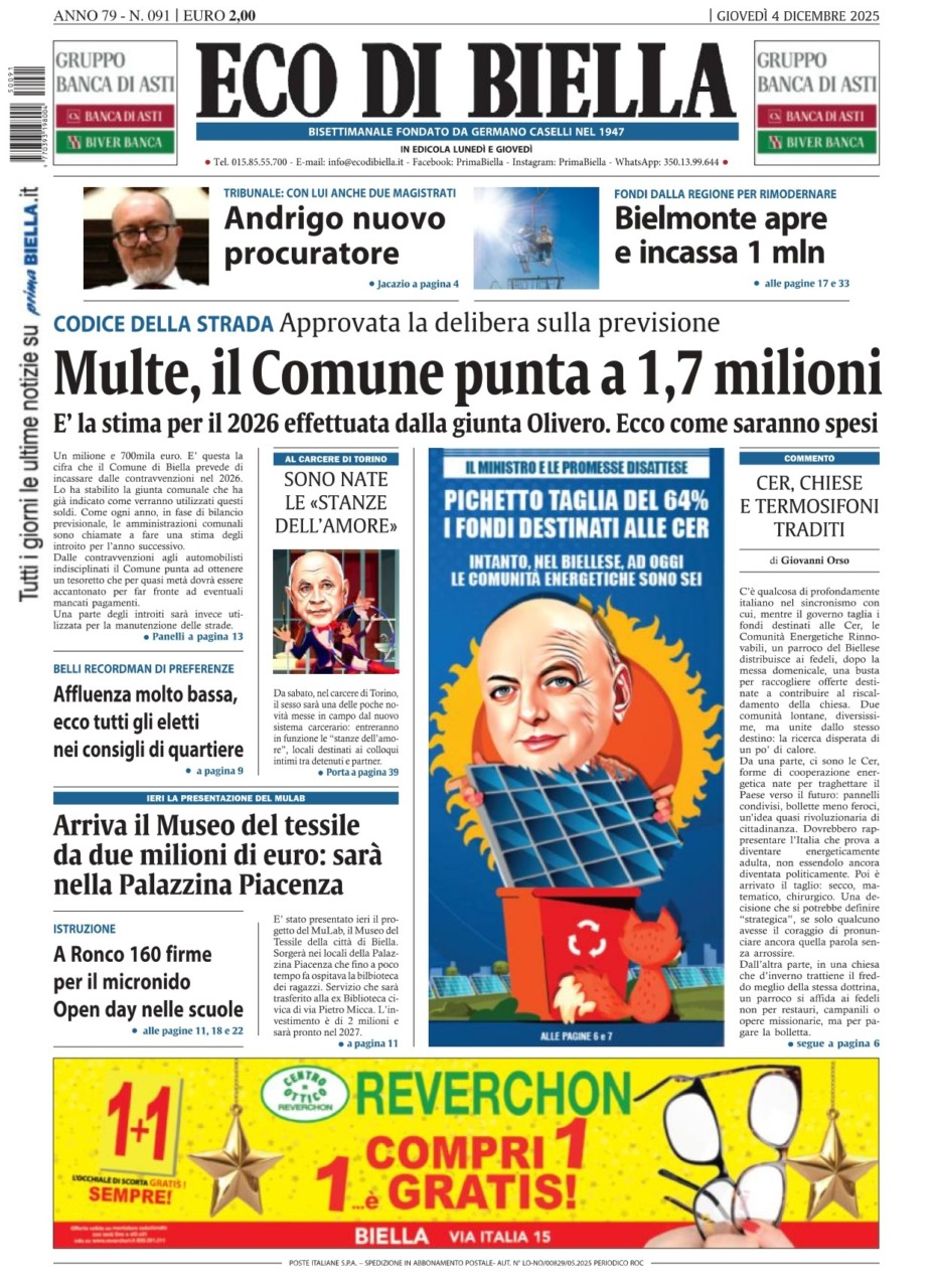 Eco di Biella torna in edicola oggi, giovedì 4 dicembre, con tante notizie e approfondimenti, tra cui in apertura: “Multe, il Comune punta a 1,7 milioni”.Un milione e 700mila euro. E’ questa la cifra che il Comune di Biella prevede di incassare dalle contravvenzioni nel 2026. Lo ha stabilito la giunta comunale che ha già indicato come verranno utilizzati questi soldi. Come ogni anno, in fase di bilancio previsionale, le amministrazioni comunali sono chiamate a fare una stima degli introito per l’anno successivo.