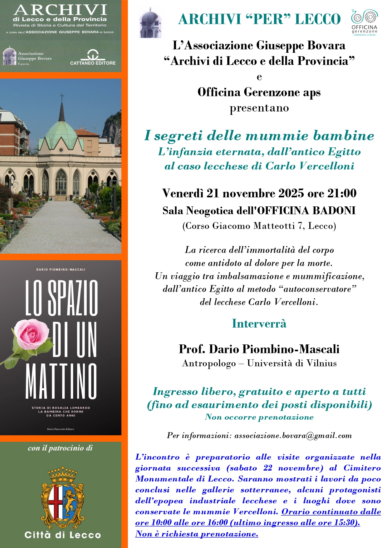 All’interno del ciclo “Archivi per Lecco”, nella Sala Neogotica di Officina Badoni (Corso Matteotti 7), sarà presente il prof. Dario Piombino-Mascali, antropologo dell’Università di Vilnius e conservatore delle Catacombe dei Cappuccini di Palermo. Il professore presenterà il suo libro Lo spazio di un mattino, offrendo una riflessione sul tema delle “mummie bambine” e sul modo in cui l’infanzia è stata eternata dall’antico Egitto fino all’esperienza lecchese di Carlo Vercelloni.
