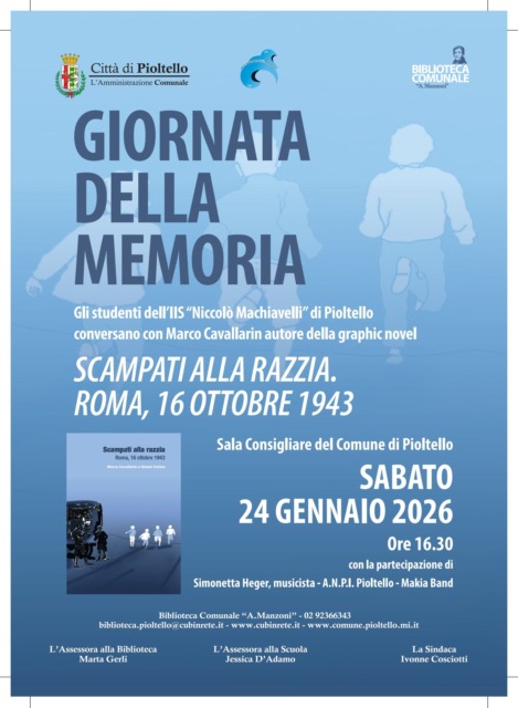 Sabato 24 gennaio 2026, alle 16.30, presso la Sala Consiliare di piazza dei Popoli, gli studenti dell’Istituto Machiavelli di Pioltello dialogheranno con Marco Cavallarin, autore della graphic novel “Scampati alla razzia. Roma, 16 ottobre 1943”, che racconta una delle pagine più drammatiche della nostra storia.