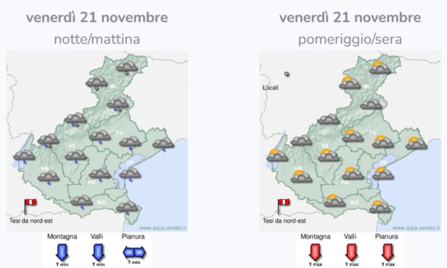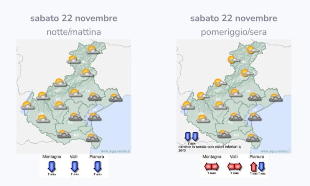 - Temperature. Minime in calo, raggiunte in serata e con valori inferiori a zero anche in pianura; massime in rialzo sulla pianura centrale e occidentale, in locale variazione sulle restanti zone.