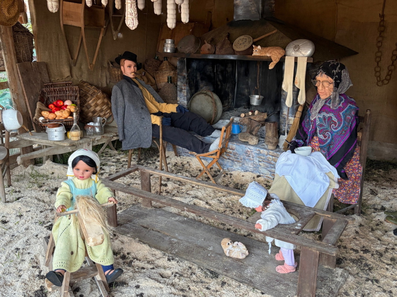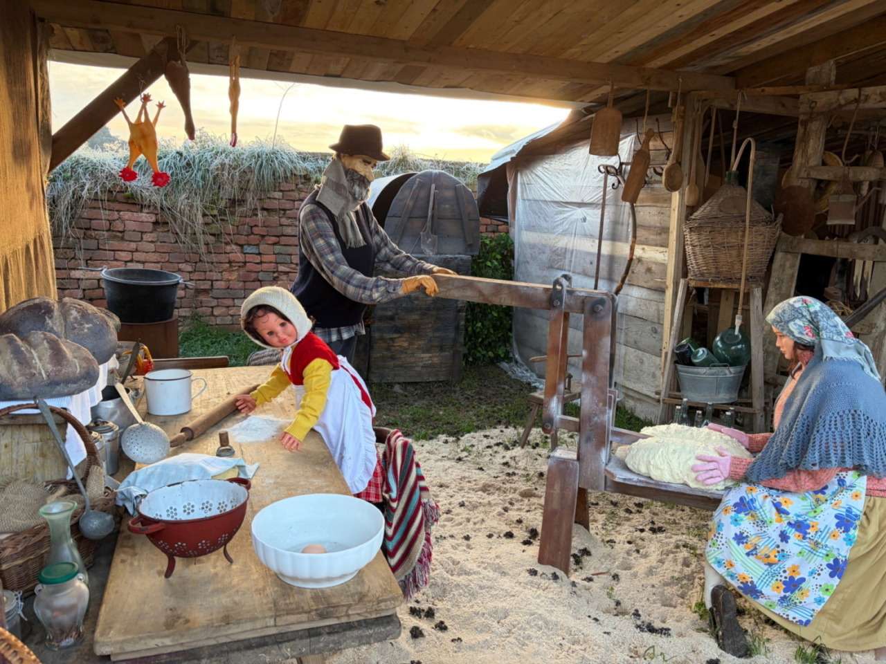 Nella casa contadina compaiono la cucina d’epoca, la nonna con i più piccoli, la mamma e l’altra nonna che preparano il corredo, mentre si nota la levatrice che si affaccia dalla porta. Non mancano inoltre gli strumenti per fare il pane, i prodotti agricoli, i salami appesi, i panni stesi e persino il bagno esterno, ricostruito con cura insieme a mobili e attrezzi autentici.
