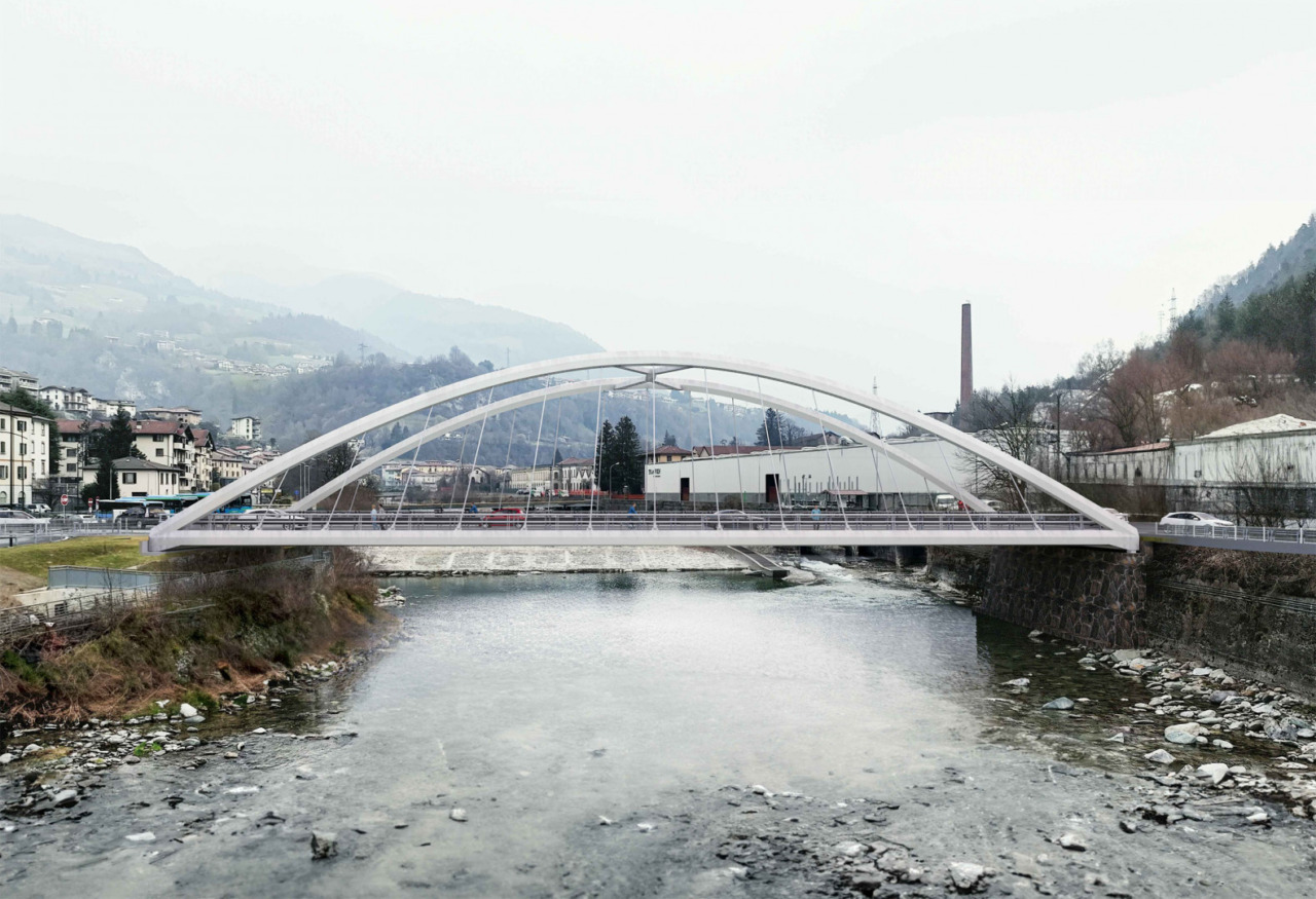 Per quanto riguarda l’intersezione del ponte con la viabilità esistente su via Ernesto de Angeli, si prevede la realizzazione di una mini rotatoria completamente sormontabile al fine di gestire in modo efficiente i flussi di traffico provenienti da nord e sud, in particolare quello diretto verso le aree produttive limitrofe, e del Parco Ramello del comune di Ponte Nossa. Collegandosi alla rotatoria recentemente realizzata, il ponte costituisce il completamento, verso la zona produttiva del paese, del riassetto di uno snodo viabilistico importante per tutta l’Alta Valle Seriana, con un traffico quotidiano di oltre ventunomila veicoli.