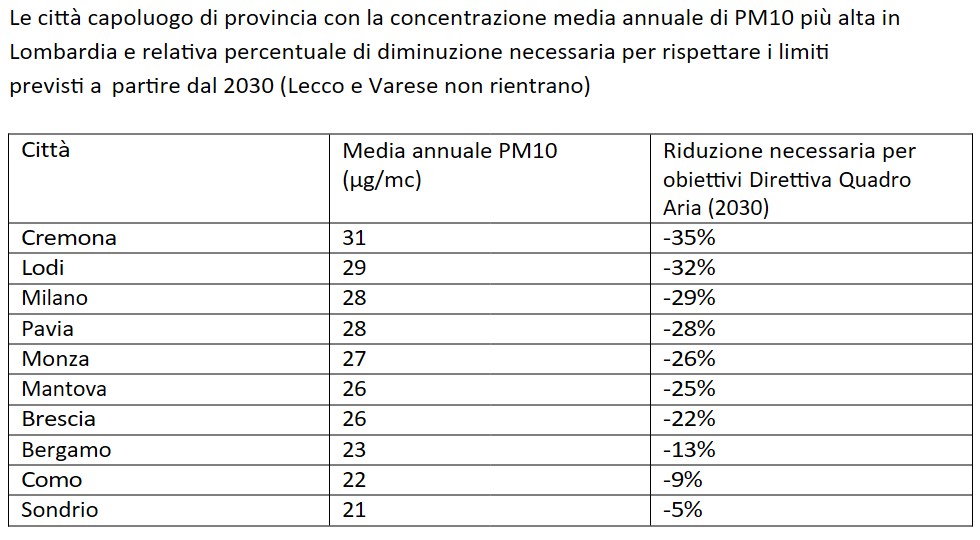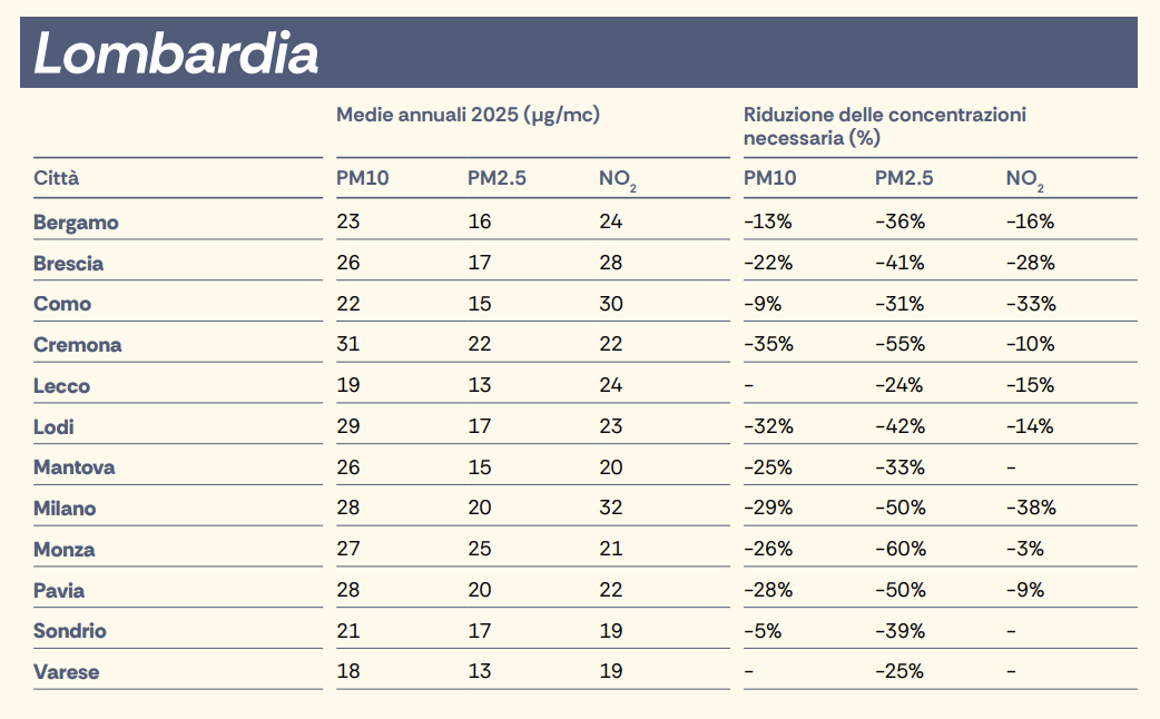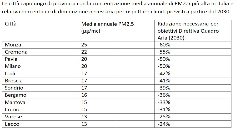 La situazione appare ancora più complessa sul fronte del Pm 2,5. In questo caso Pavia figura ai vertici della classifica negativa: quarta tra i capoluoghi italiani e terza in Lombardia. Per allinearsi ai parametri europei, sarebbe necessario un taglio delle emissioni addirittura del 50%.