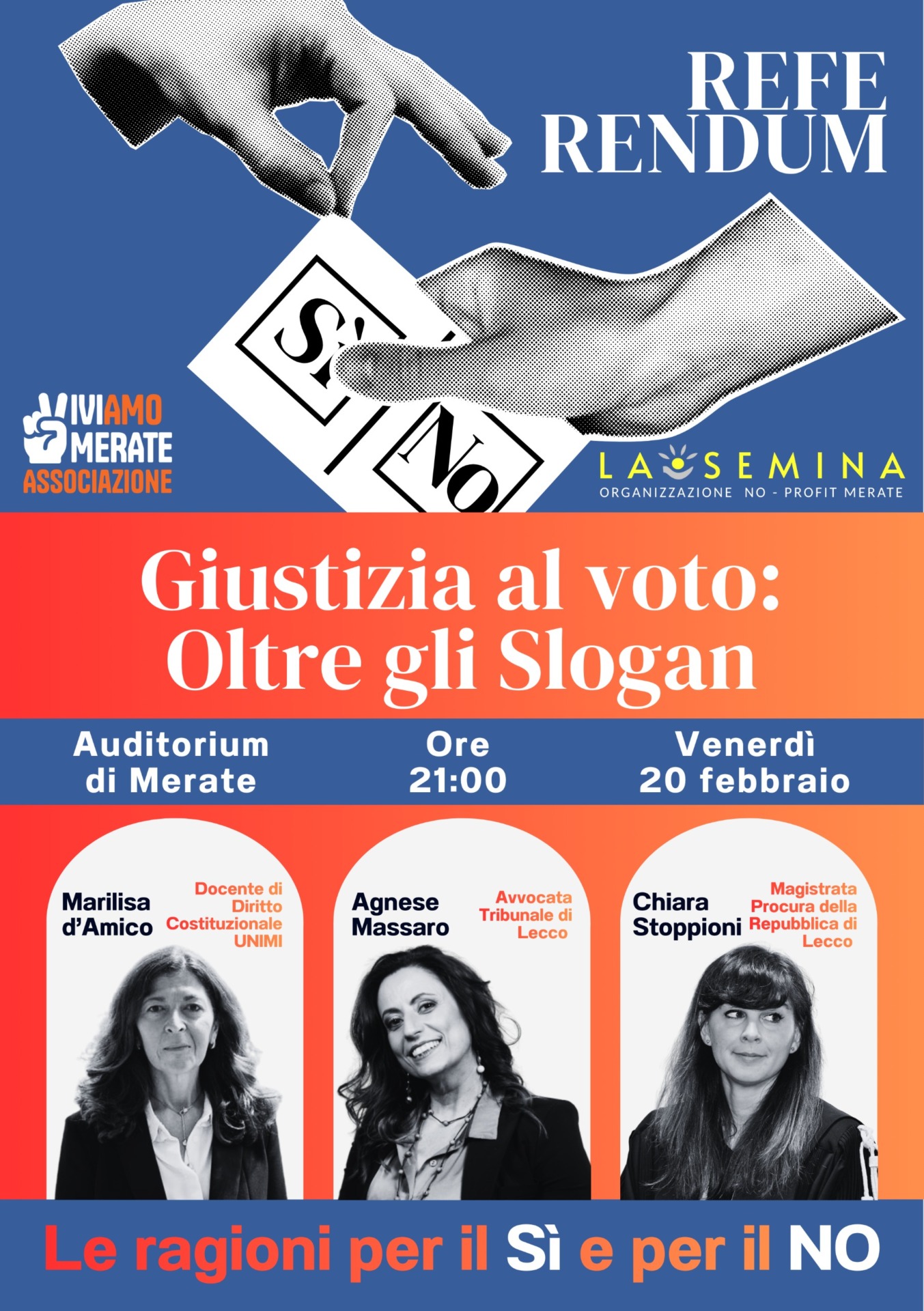 Le associazioni ViviamoMerate e La Semina propongono un confroto dal titolo «Giustizia al voto: oltre gli slogan», in programma venerdì 20 febbraio alle 21 nell’auditorium comunale di piazza degli Eroi a Merate.