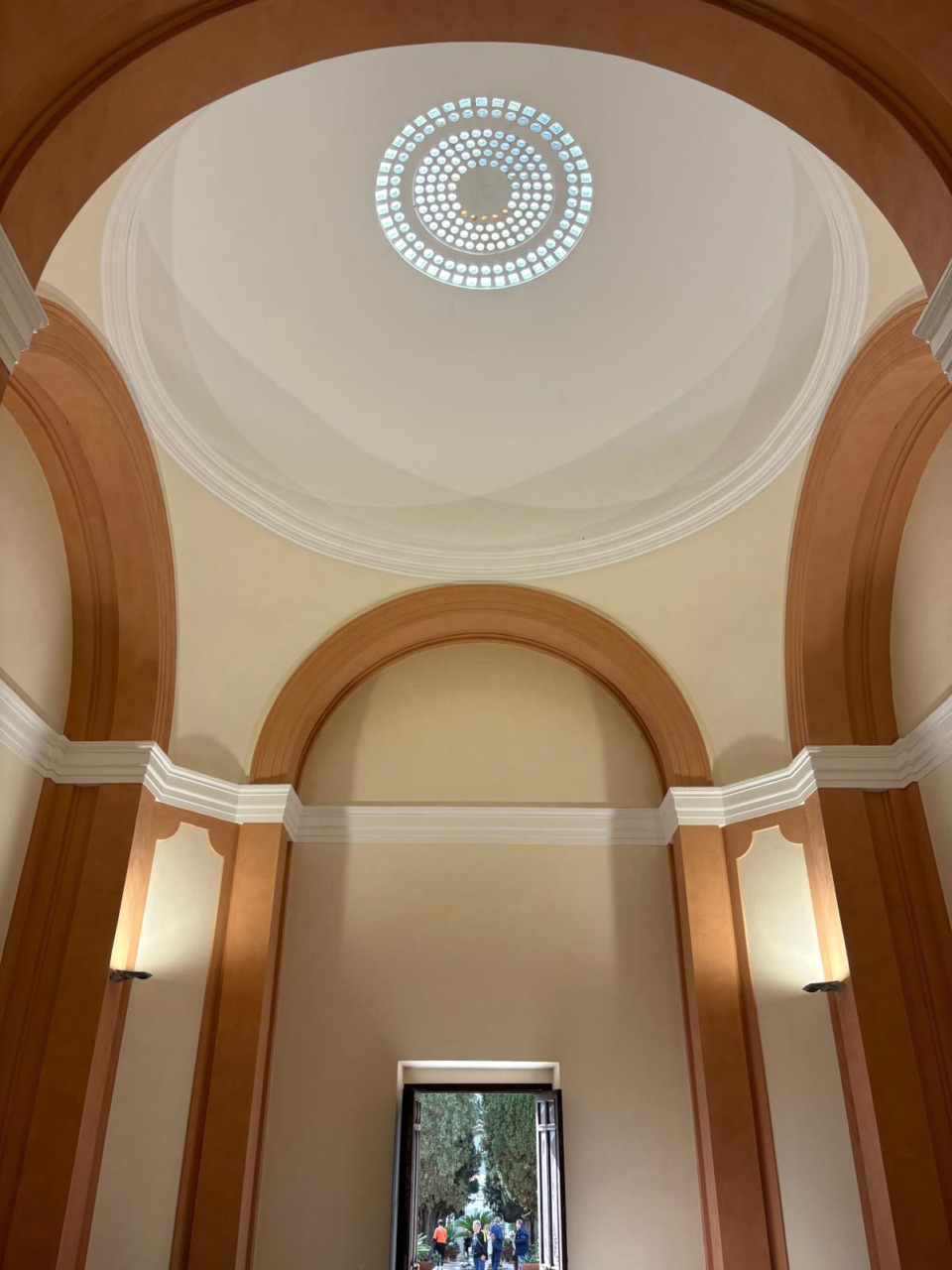 Tra i risultati più significativi, la ricerca sui colori originali ha consentito di eliminare gli elementi aggiunti nel corso dei decenni. La raschiatura delle tinte ha rivelato una parte della scritta storica del fregio della facciata oggi tornata visibile. Gli elementi architettonici “a tempio” – con le loro colonne, l’architrave e il timpano – sono stati restituiti alla loro eleganza originale, con tinte a finto travertino e tonalità fedeli al progetto iniziale.
