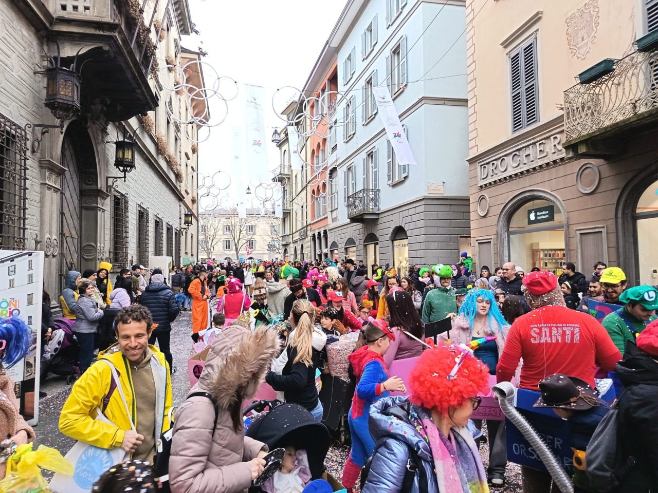 Un momento clou della giornata si è svolto nel cuore di Piazza Campello, dove i partecipanti sono stati ammirati e giudicati dalla giuria del Carnevale, posizionata sul balconcino del Comune di Sondrio, in pieno centro storico. Qui la fantasia e l’impegno dei gruppi si sono mescolati alle risate dei più piccoli, trasformando la piazza in un vero palcoscenico a cielo aperto.