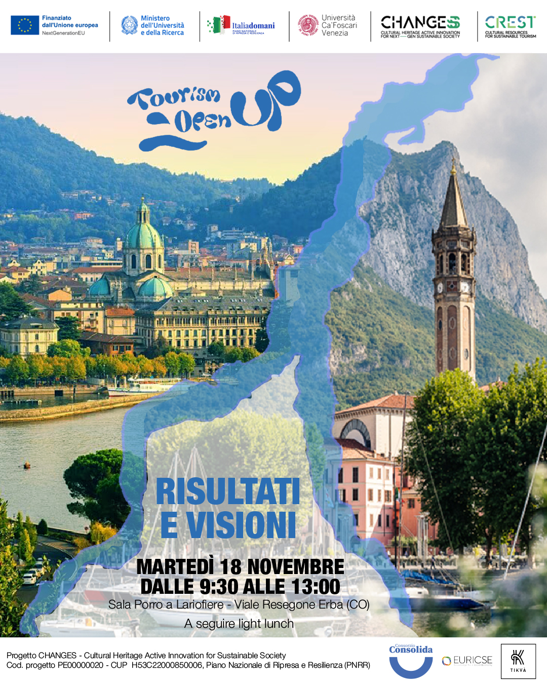 “Tourism open up, risultati e visioni”: martedì 18 novembre 2025 dalle 9:30 alle 13 nella Sala Porro – Lariofiere (viale Resegone, Erba) si terrà l’evento che nasce nell’ambito del progetto di ricerca “Tourism Open Up”, sviluppato all’interno del Bando CHANGES/CREST – Spoke 9, finanziato da Università Ca’ Foscari di Venezia e promosso da Consorzio Consolida, in partnership con EURICSE e la cooperativa sociale Tikvà – Economie Territoriali Inclusive.