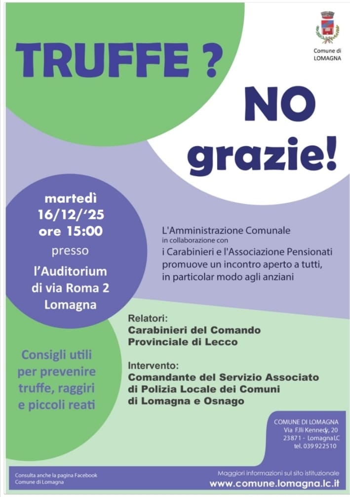 L’incontro si terrà nel pomeriggio di martedì 16 dicembre, dalle 15 alle 17, presso l’Auditorium Comunale di via Roma n.2, a Lomagna. Come relatori saranno presenti i Carabinieri del Comando Provinciale di Lecco, mentre svolgerà un intervento il Comandante del Servizio Associato di Polizia Locale dei Comuni di Lomagna e Osnago.