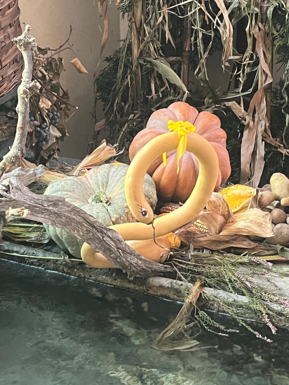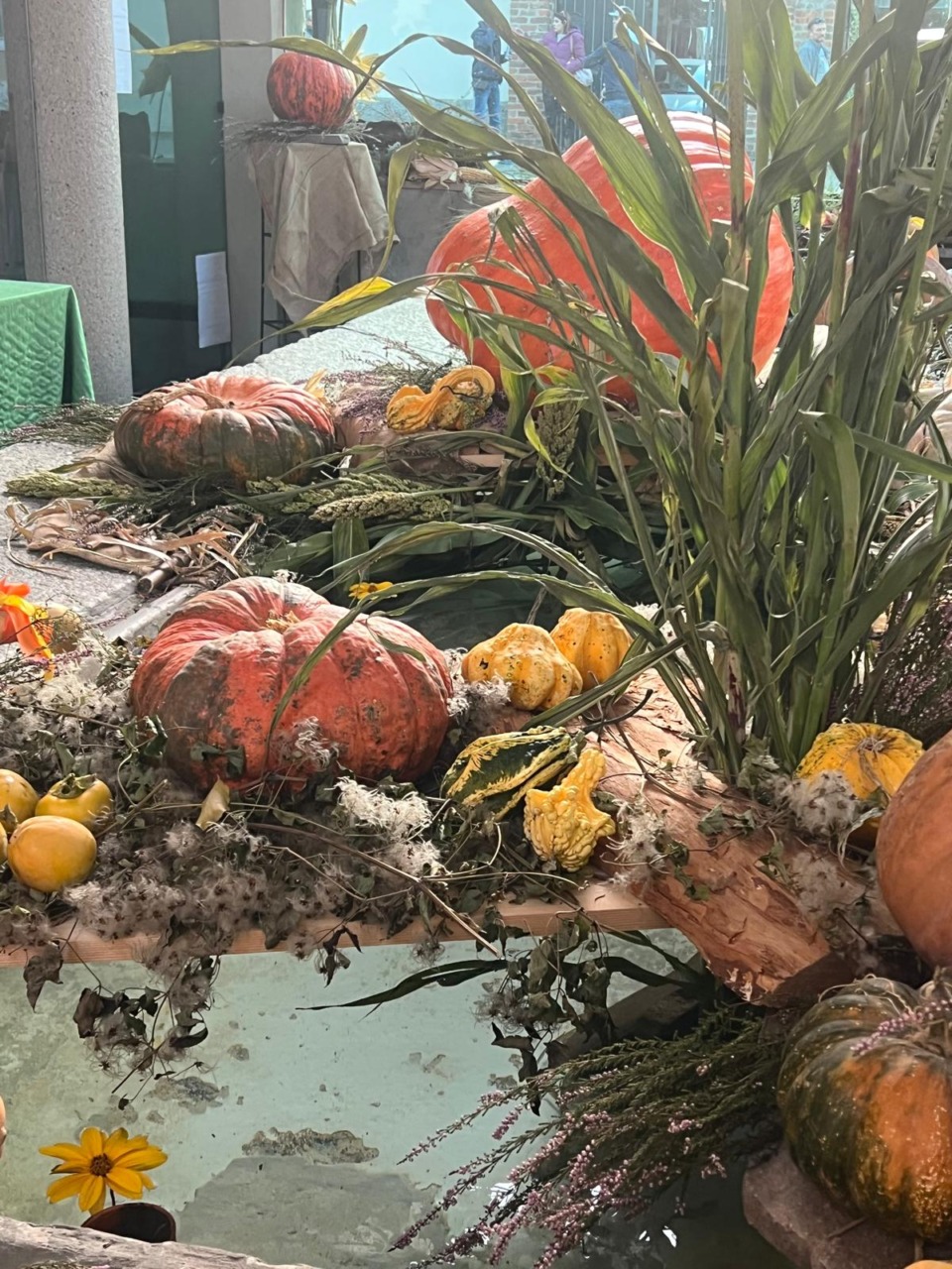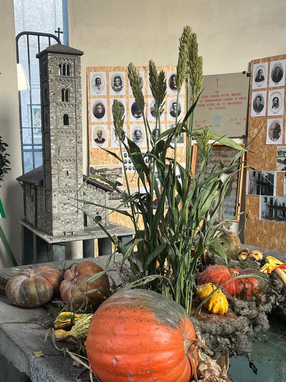Un allestimento autunnale con zucche e spighe per ricordare le vittime del bombardamento