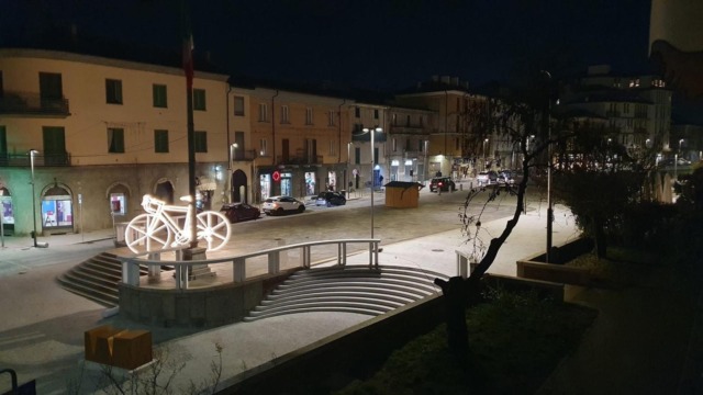 La grande bicicletta luminosa, ben visibile da via Vittorio Veneto, si propone come un simbolo immediatamente riconoscibile dell’evento e come un forte richiamo visivo per cittadini e visitatori.