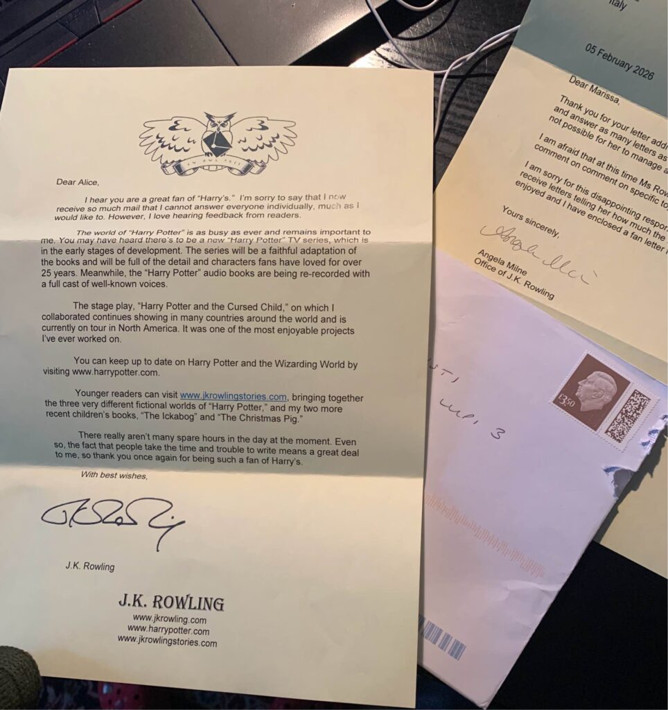 Ieri (mercoledì 18 febbraio 2026, ndr), il piccolo miracolo: una busta proveniente direttamente dagli uffici di Londra è atterrata sul nostro tavolo. All’interno, una risposta dedicata a me firmata in originale da Angela Milne, storica collaboratrice dell’autrice, e una lettera speciale per Alice, con la firma (prestampata, ma non per questo meno preziosa!) della “mamma” di Harry Potter.