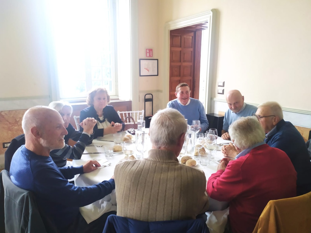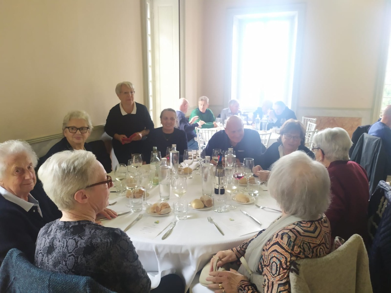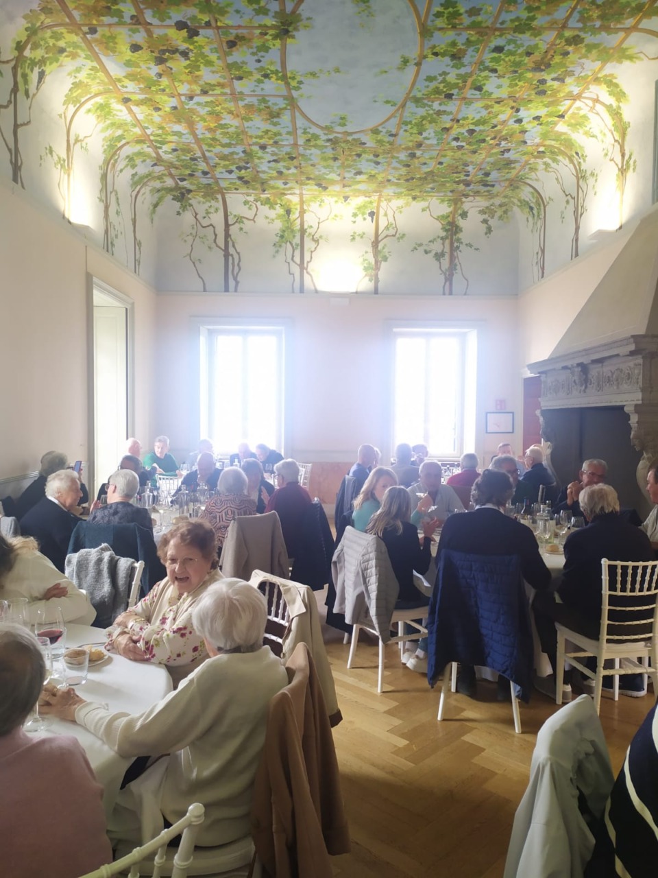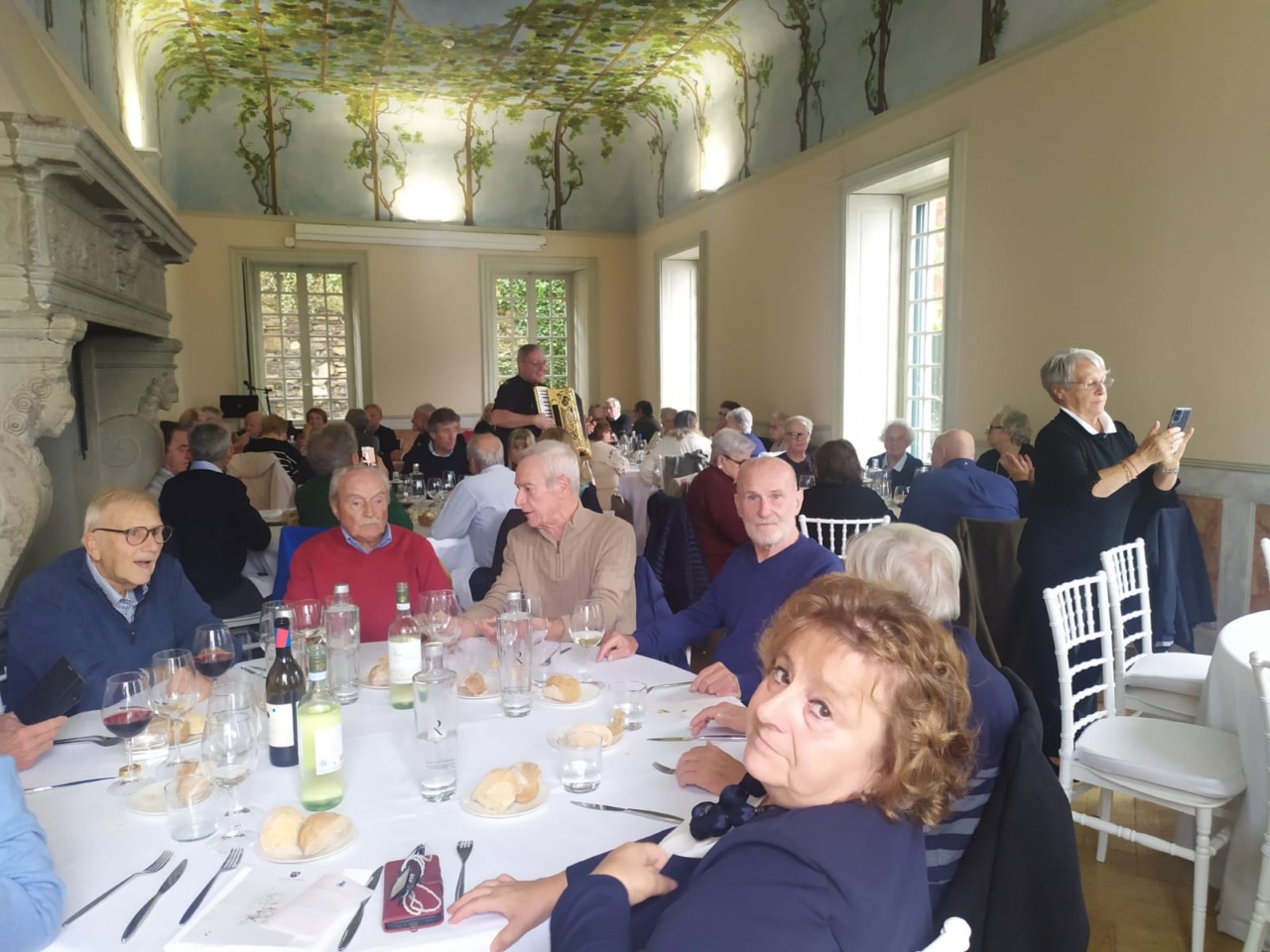 Al termine della funzione religiosa, gli ospiti si sono trasferiti nella magnifica “Sala del Pergolato” di Villa Cipressi, affacciata sui giardini e sul lago, dove li attendeva un pranzo conviviale preparato con cura. Il menù, pensato per valorizzare i sapori della tradizione locale, ha riscosso grande apprezzamento tra i commensali, che hanno potuto gustare piatti genuini in un clima di allegria e serenità. La sala, elegantemente allestita per l’occasione, ha fatto da cornice a momenti di dialogo, ricordi e nuove amicizie.