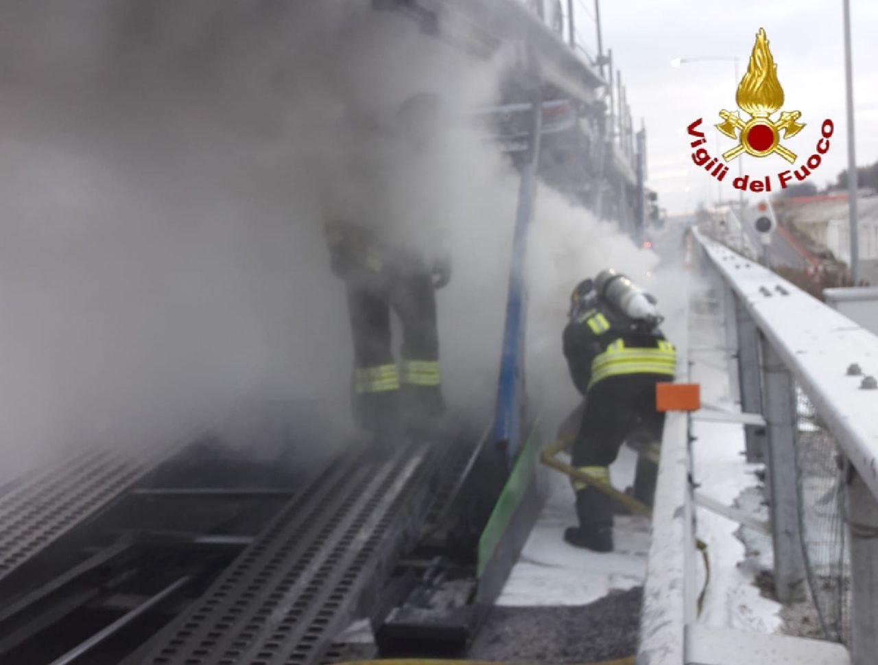 Le fiamme che hanno coinvolto l’impianto frenante della bisarca