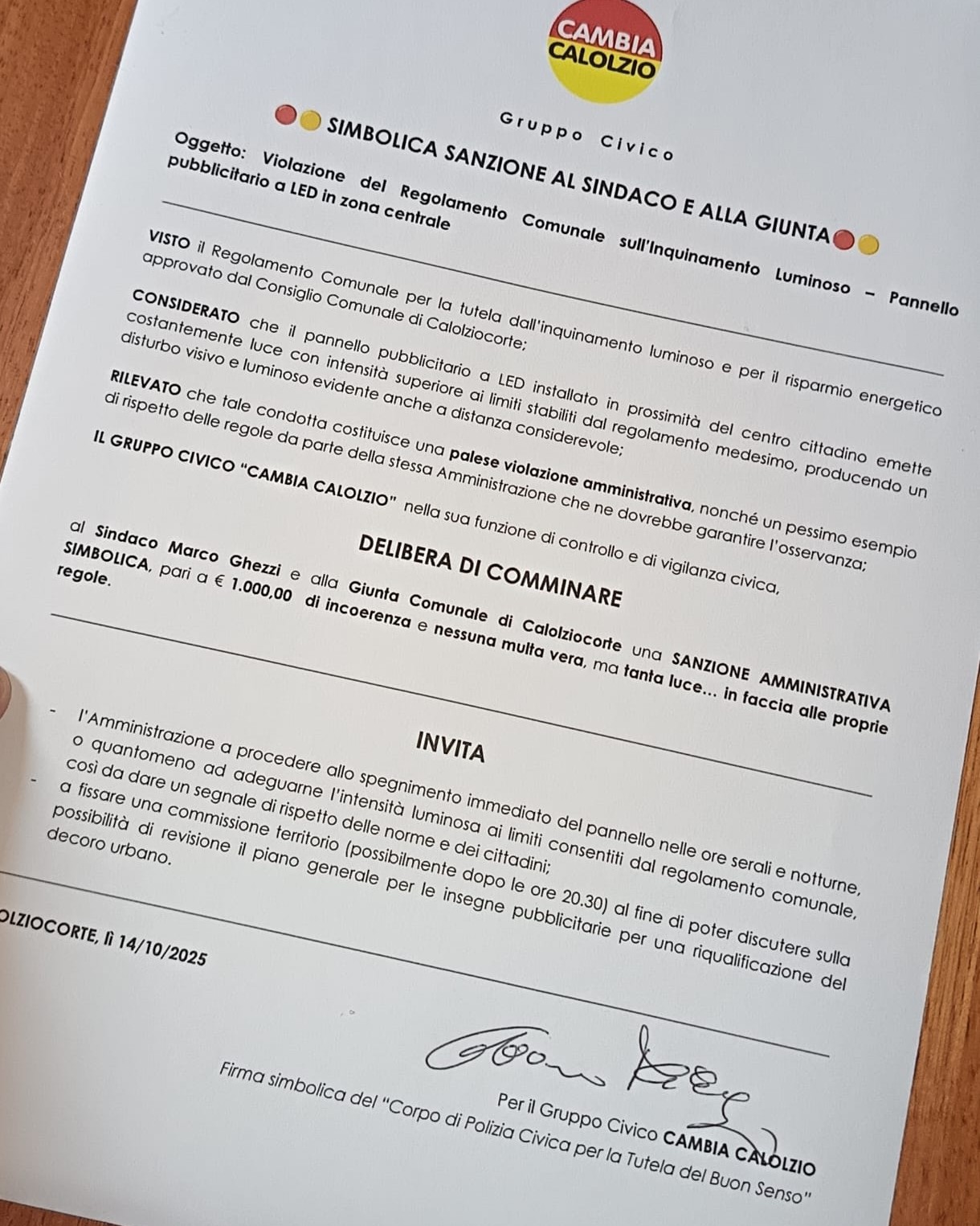 «Possibile che nessuno abbia riflettuto sulle conseguenze del fascio luminoso? Possibile che regolamenti comunali, regionali e nazionali siano stati violati senza che nessuno se ne accorgesse?» si chiede Colosimo. Dopo settimane di segnalazioni e una lettera ufficiale inviata al sindaco e agli uffici competenti, Cambia Calolzio ha deciso di passare alle «maniere forti» comminando una sanzione amministrativa simbolica al primo cittadino Marco Ghezzi e alla Giunta, pari a «mille euro di incoerenza», per «aver mantenuto acceso il pannello giorno e notte in violazione dei limiti di luminosità».