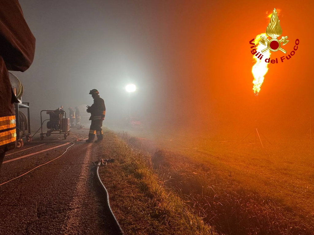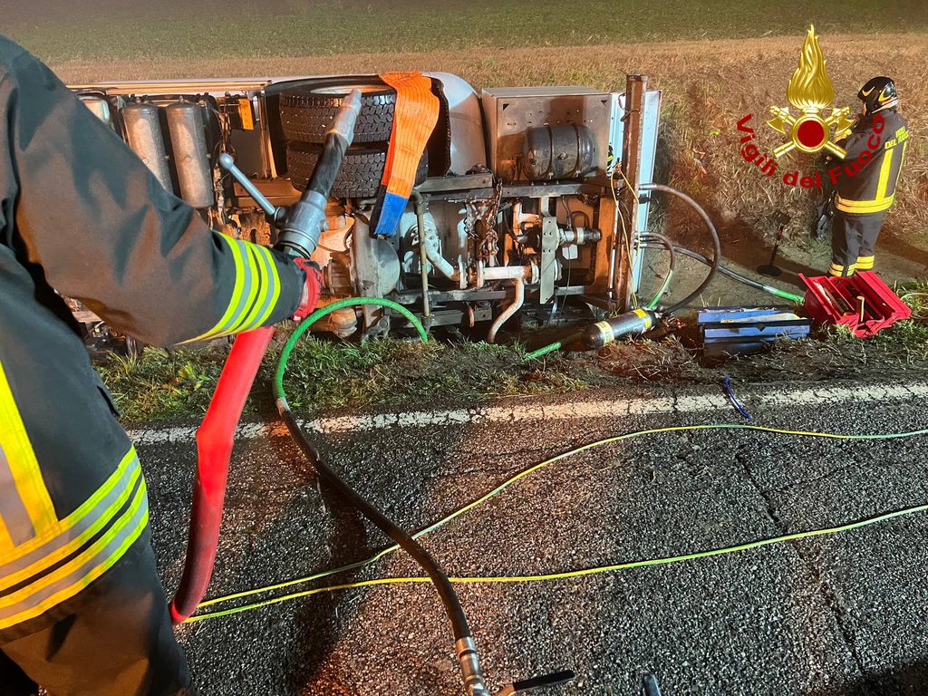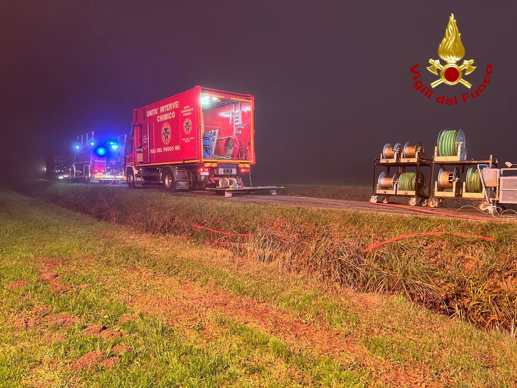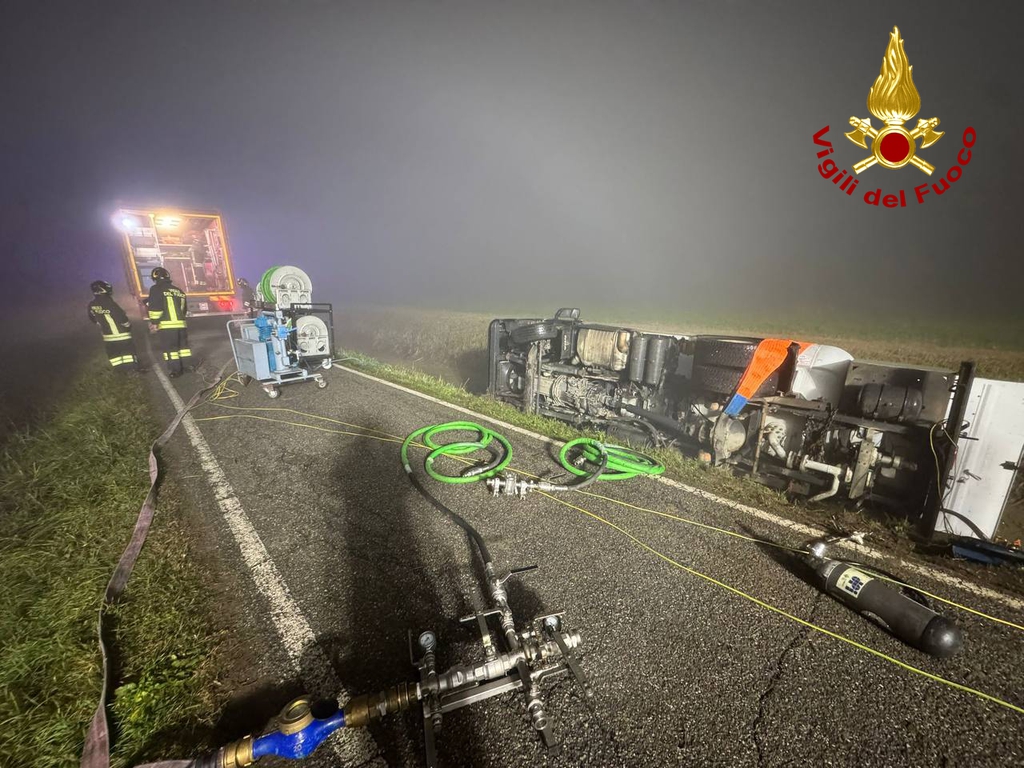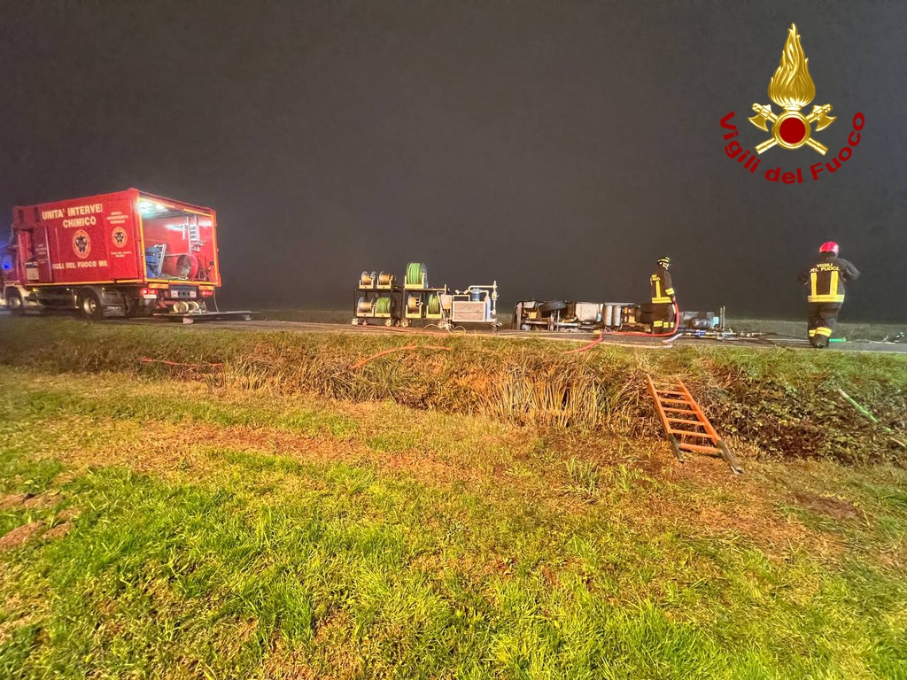 Una cisterna di Gpl finisce nel fosso in mezzo ai campi a Brembio lungo la provinciale 168: vigili del fuoco al lavoro da quasi 24 ore.