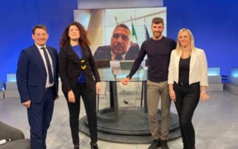 Christopher Rainoldi (il secondo da destra), ospite di una puntata della trasmissione Tg Economy andata in onda il 30 gennaio del 2024