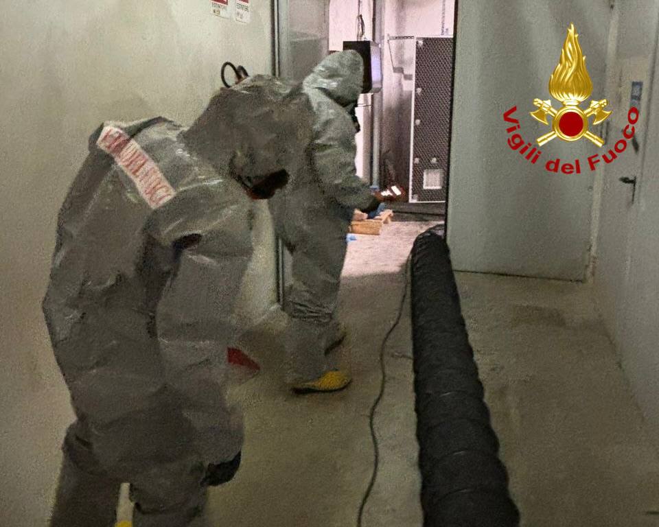 Con vestizione adeguata (tute NBCR tipo 3 e maschere pieno facciale con filtri ABEK) sono stati effettuati dei campionamenti dell’aria del supermercato,  nel frattempo evacuato, e un sopralluogo agli impianti.
